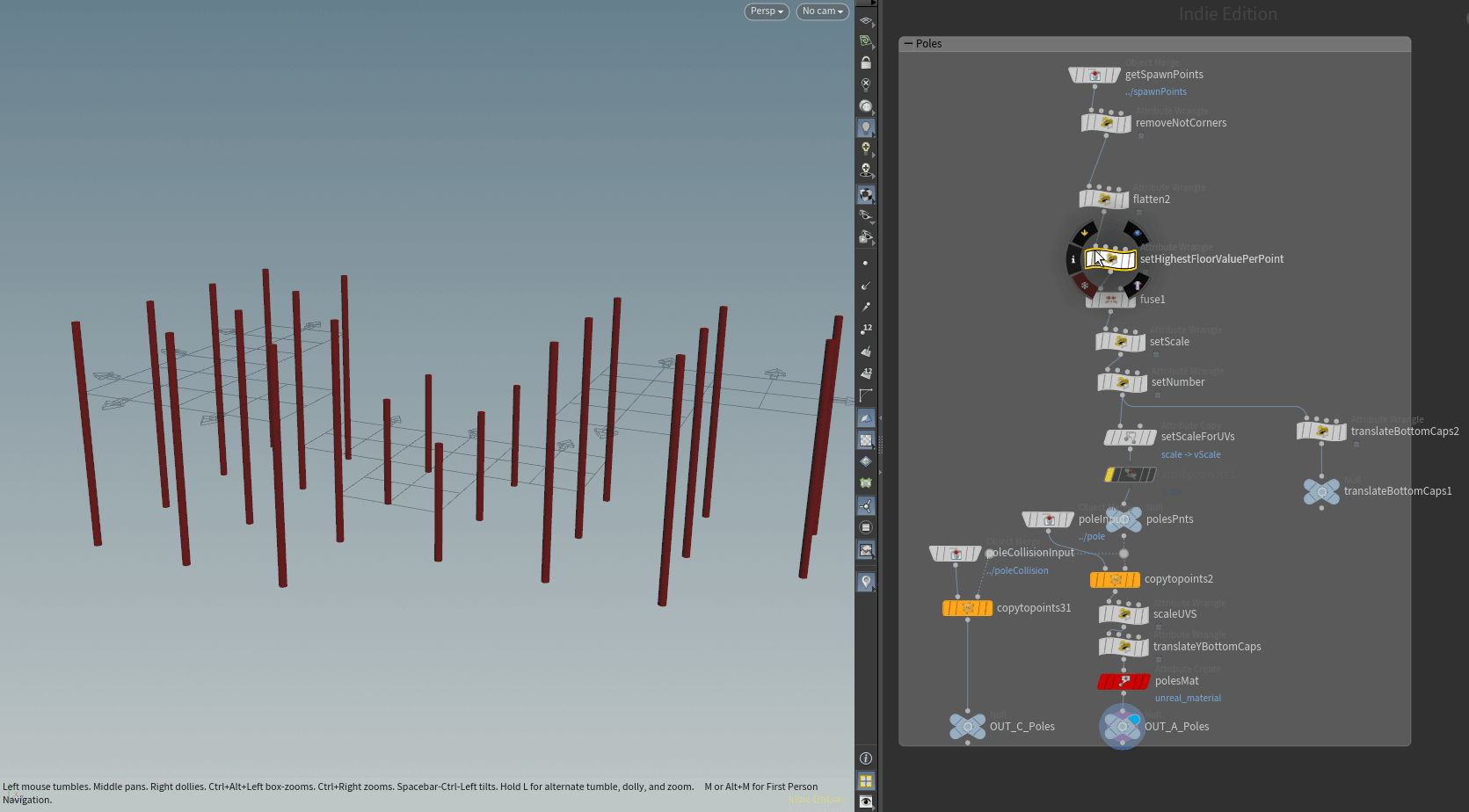 Estoy configurando la escala de cada punto, lo que controlará el tamaño de los postes cuando use el nodo "copiar a puntos". Estoy multiplicando el atributo de piso con la altura del poste, lo que asegurará que el tamaño de los postes se amplíe cuando se suba de nivel. Luego, después de "copiar a puntos", también estoy aplicando la misma escala a los rayos UV de los postes, para que también se basen en la altura del poste y no se estiren.