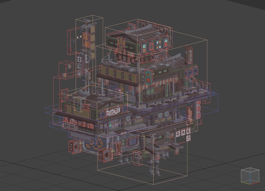 El artista de la serie describe su proceso creativo para crear una obra de arte voxel. Comienza por elegir el estilo de la arquitectura y el color principal de la escena, utilizando casas tradicionales de su ciudad natal como referencia para esta obra en particular. Agrega elementos emisores como linternas de colores y letreros luminosos para ampliar la paleta de colores y hace que la escena sea más interesante. Además, agrega detalles modernos como cables y luces eléctricas a las casas tradicionales para fusionar el estilo elegido de ciencia ficción y ciudad de neón. Finalmente, entierra una historia en la obra, haciendo que el restaurante en la escena sea en realidad una organización de protección de peces.