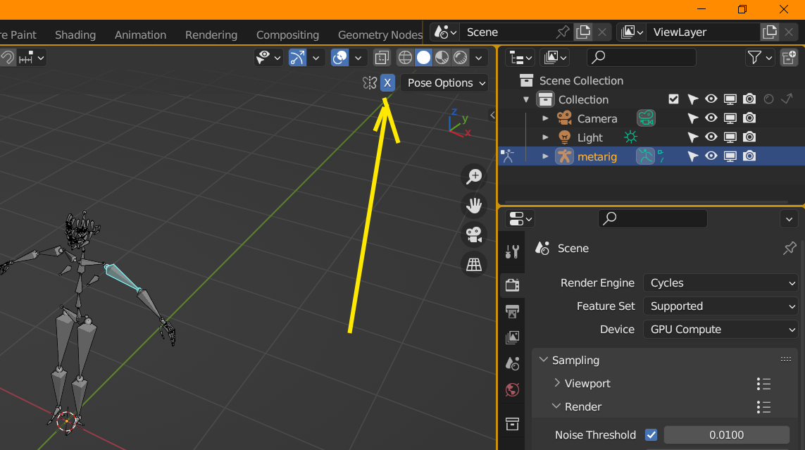 Aquí se puede apreciar el resultado, esto ocurre al mover el hueso que está seleccionado en la imagen, el otro se copia automáticamente desde el lado opuesto.
