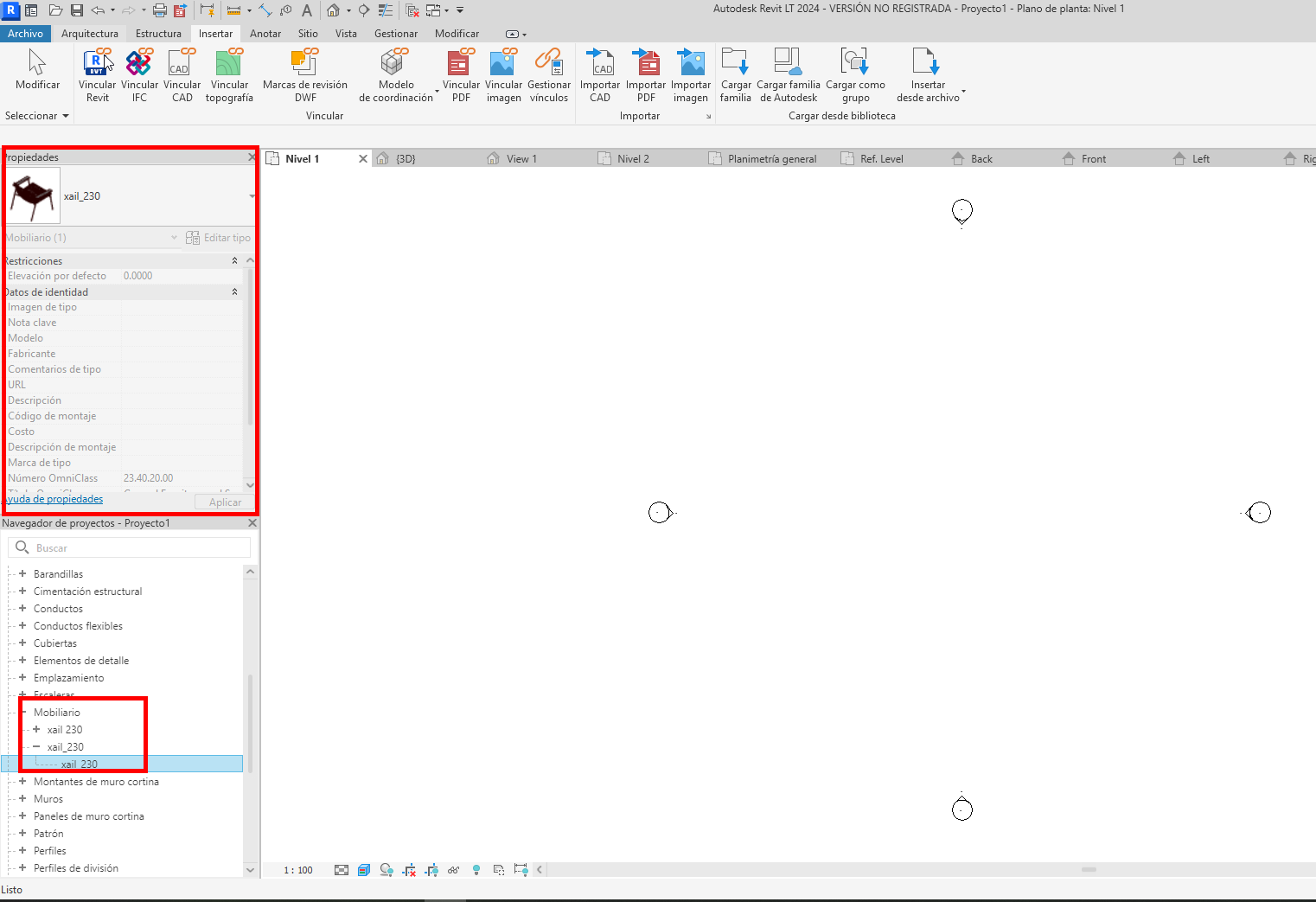 En el Navegador de proyectos, selecciona la categoría de Mobiliario y busca la familia xail_230.