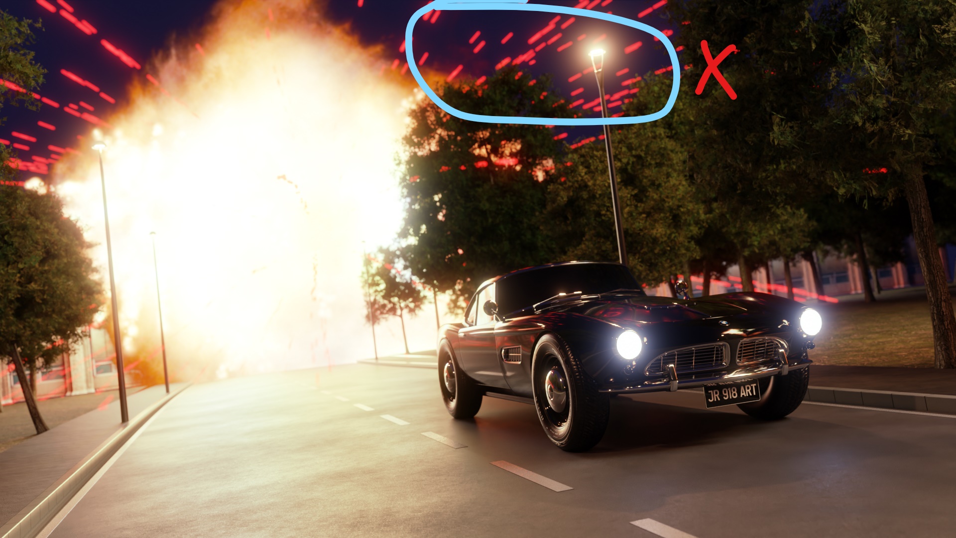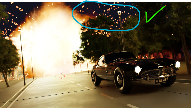 Es que cuando voy al viewport del render, las partículas amarillas de la explosión tienen forma de pequeñas bolitas, lo cual me gusta cómo quedan. Pero cuando renderizo la imagen, las pequeñas bolitas se cambian a unas líneas. No sé cómo hacer para que se vean como pequeñas bolitas de la explosión.