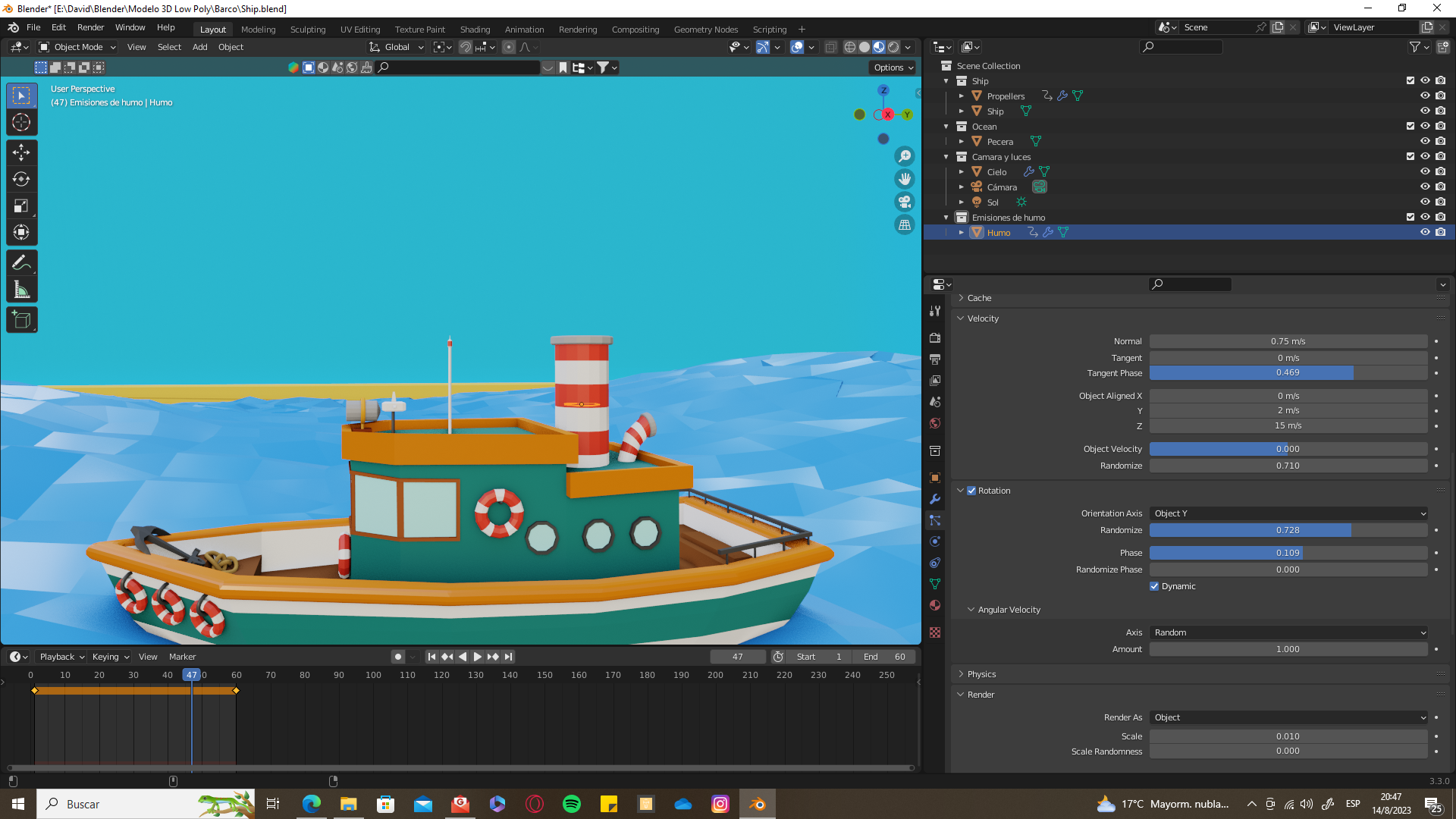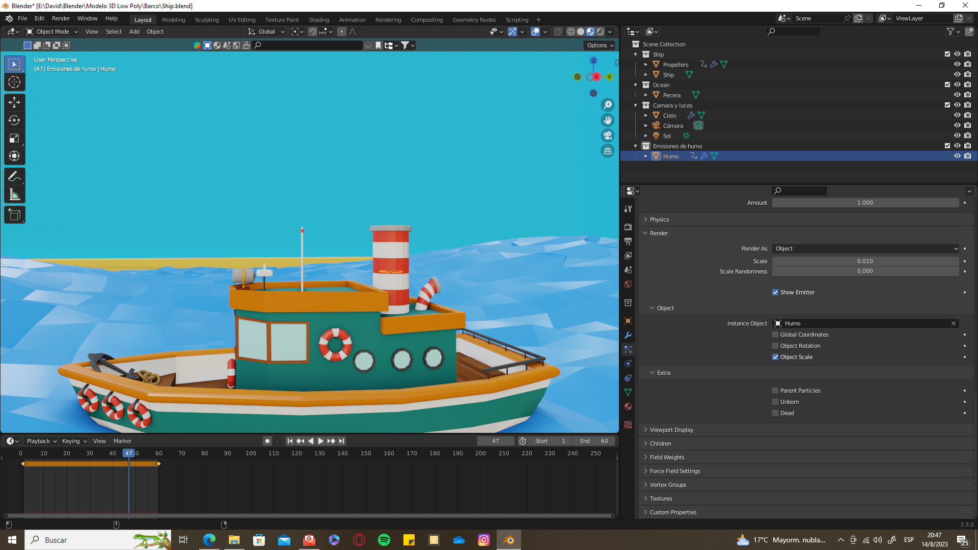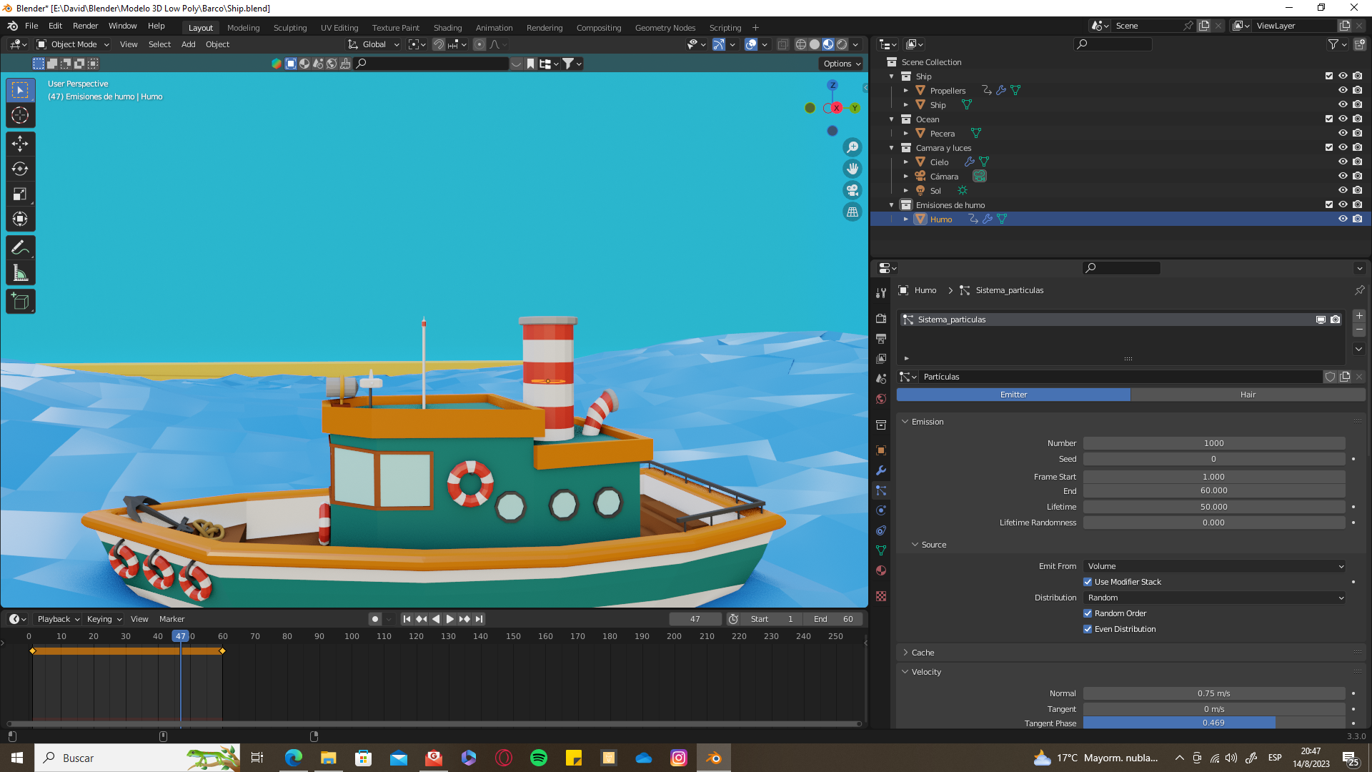 Resulta que hice un barco a vapor de baja poli, le agregué una chimenea grande, creé un nuevo objeto plano para aplicarle el sistema de partículas y crear el efecto del humo. Reproduzco la animación, aparecen las partículas y hasta ahí todo bien.