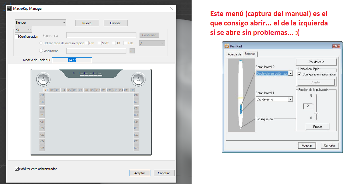 Desenterré del trastero una que compré hace mil años en Lidl que nunca llegué a usar, pero no soy capaz de configurar el lápiz... supongo que problemas de compatibilidad con W10 o algo de eso... porque sí se abre el programa para configurar las teclas de la tableta, pero no el de configurar los botones del lápiz... y me gustaría configurar uno de los botones del lápiz como si hiciera clic central del ratón para poder girar el objeto que estoy esculpiendo...