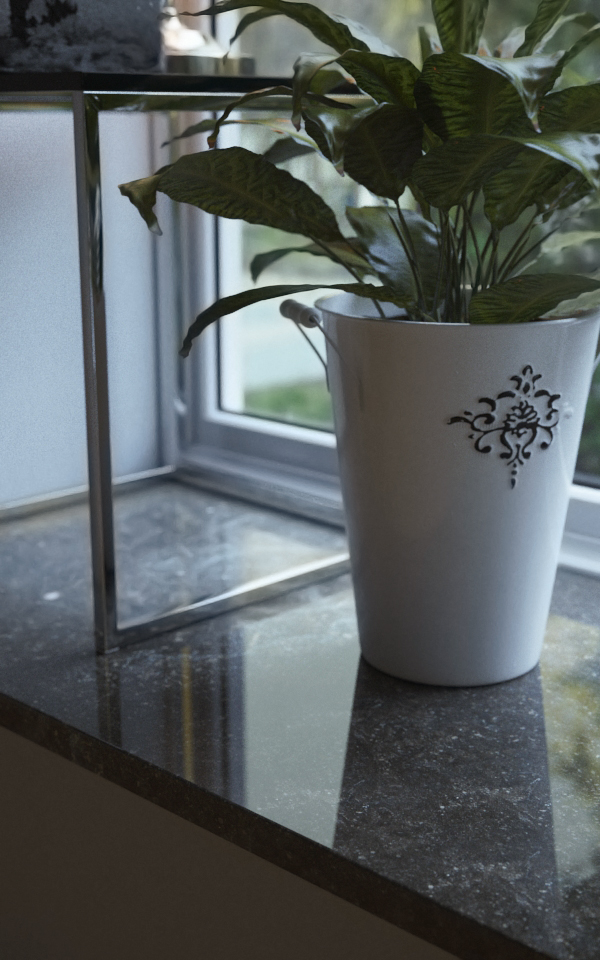 En tus imágenes se aprecia claramente que el HDRI no es reflejado como debiera ni con la intensidad que contienen este tipo de imágenes de rango dinámico alto. Se ve como la mesa no refleja el entorno con esa tonalidad azulada del exterior, como sería en la realidad. En mi caso, lo he exagerado un poco al aumentar la intensidad de la luz para comprobar que esa luz llega a todas partes (rebotes) con más claridad.