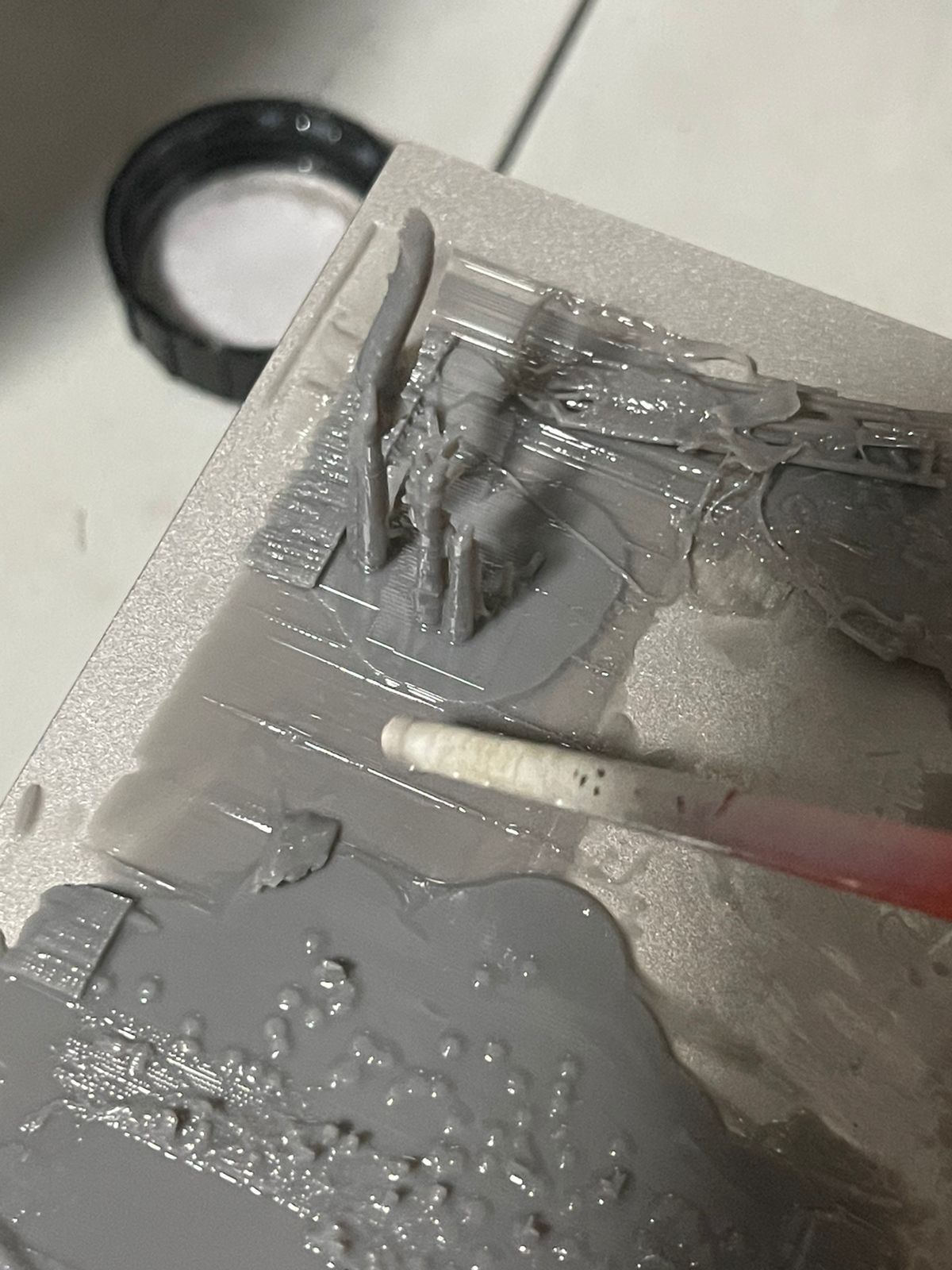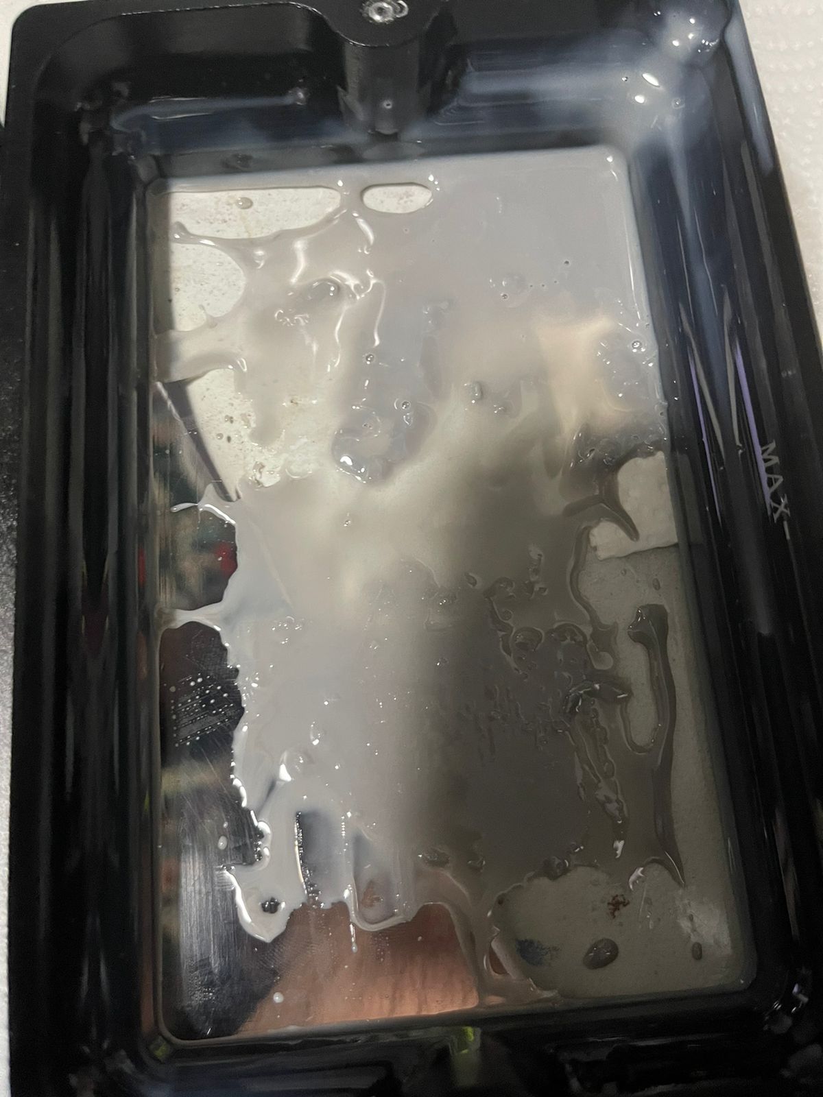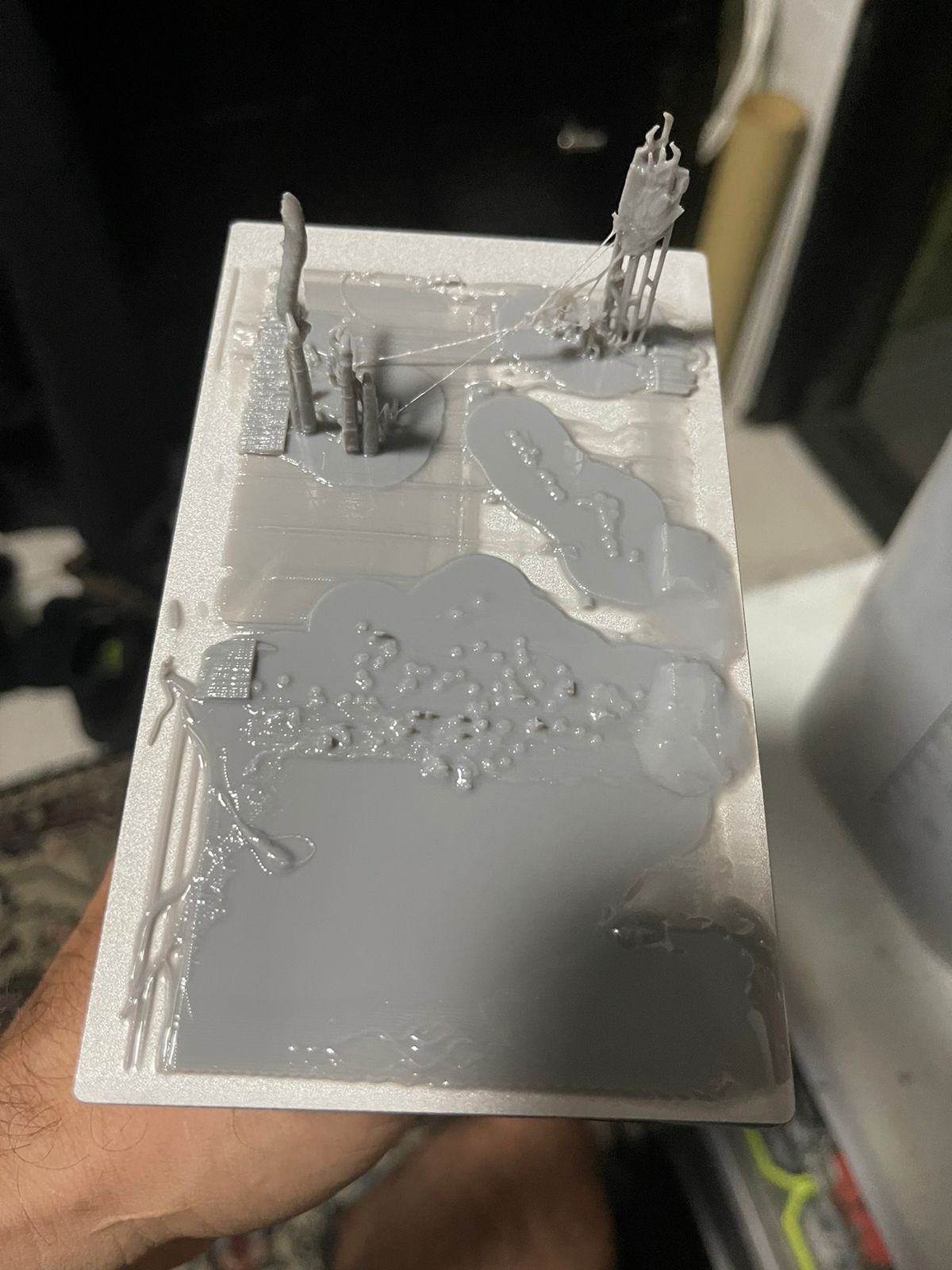 Así sale la impresión. Se puede ver cómo, además de la peana de los soportes, imprime una capa alrededor y lo hace en el FEP y en el plato.