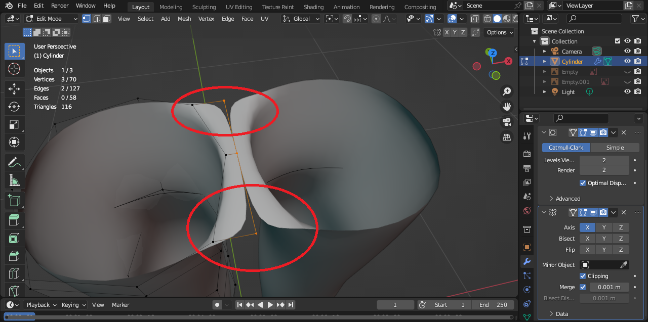 Buenas tardes/noches, tengo este problema que al usar el mirror en el centro se unen bien los puntos (tengo Clipping activado) pero no se rellena como quisiera en las esquinas. Que opción debo tocar para que rellene ese espacio en las puntas unidas? gracias a todos desde ya.