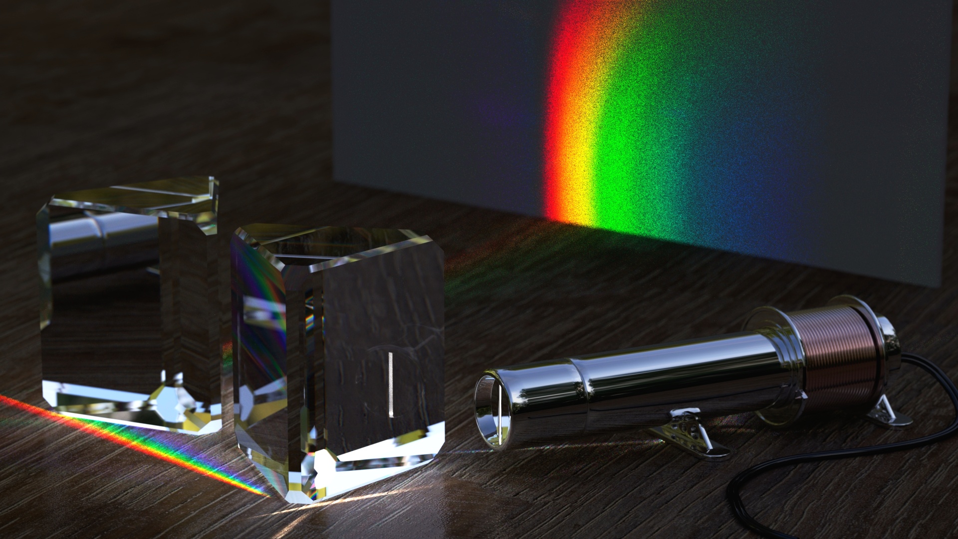 La escena está basada en un experimento antiguo que hizo Thomas Anagnostou con Rhino3d hace ya años para dividir la luz blanca en sus diferentes colores básicos.