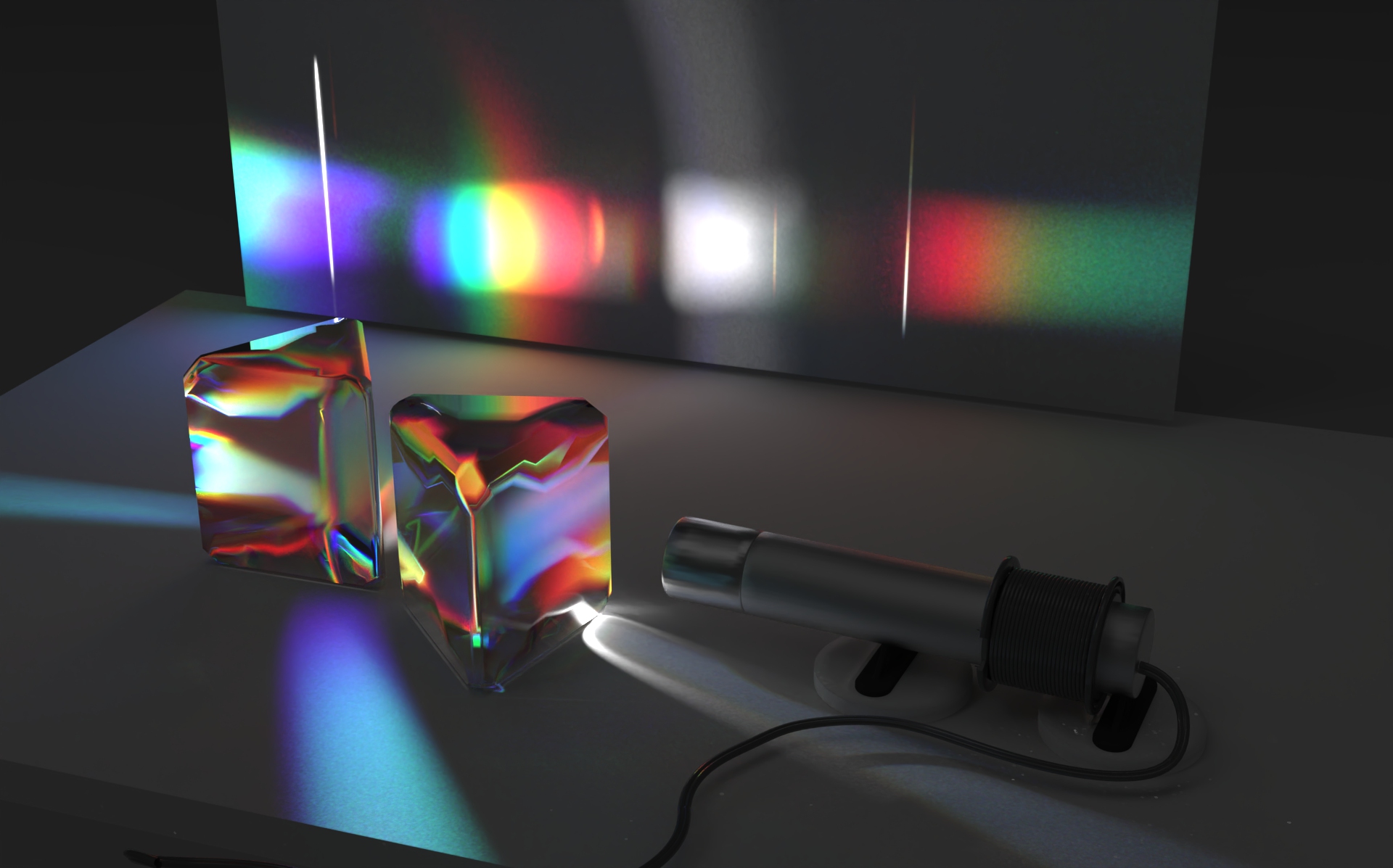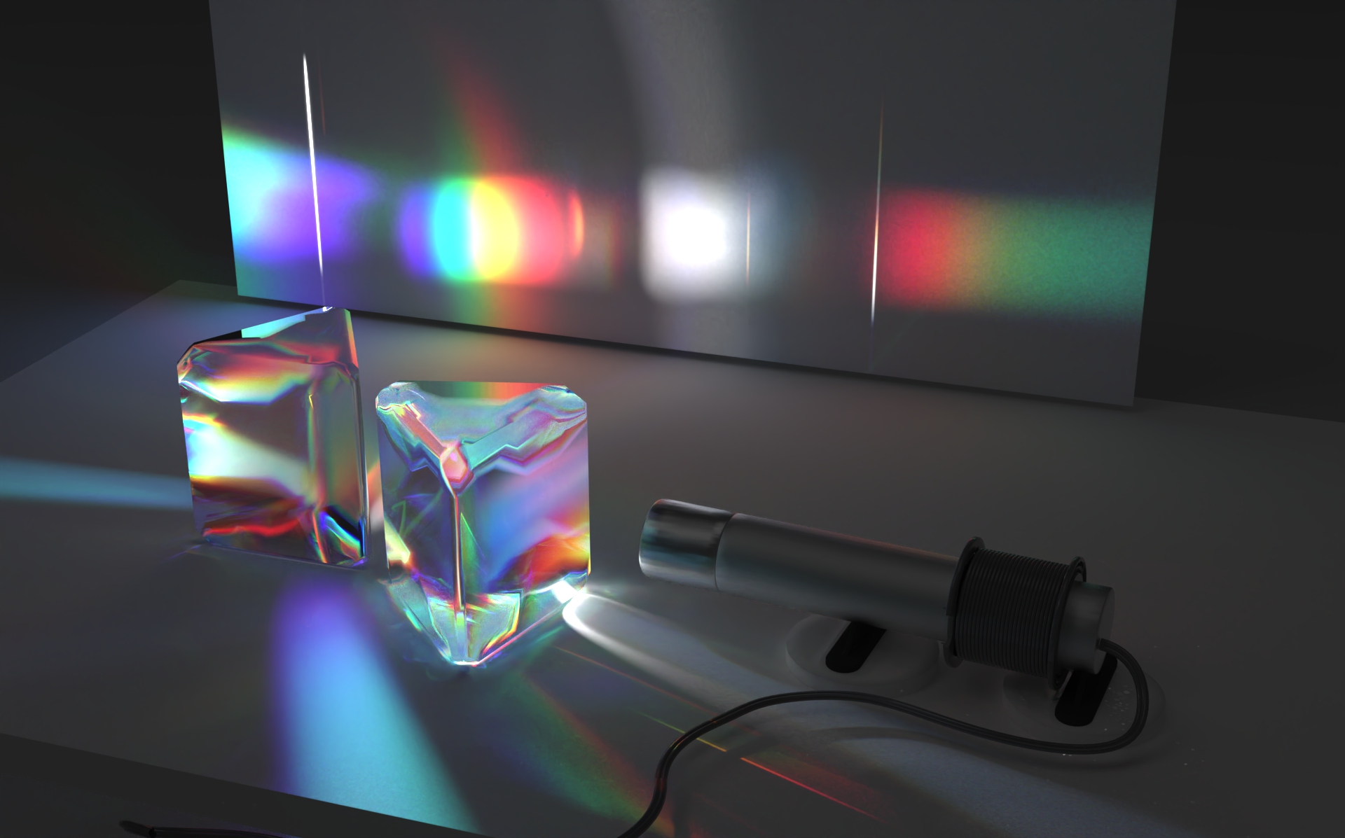 Por eso, una de las técnicas de render que se usaban antes de la implementación del Abbe para producir difracción de la luz blanca en todo su espectro era colocar tres vidrios superpuestos con pleno filtro: uno en rojo, otro en verde y otro en azul. Cada uno de los tres con índices de refracción diferentes (mayor para el azul a 1.6, menos para el verde a 1.45 y menos para el rojo a 1.3), y el efecto se producía perfectamente. Cuanto mayor es la diferencia de índices de refracción entre los tres cristales, más incrementado resulta lo que sería el valor de Abbe.