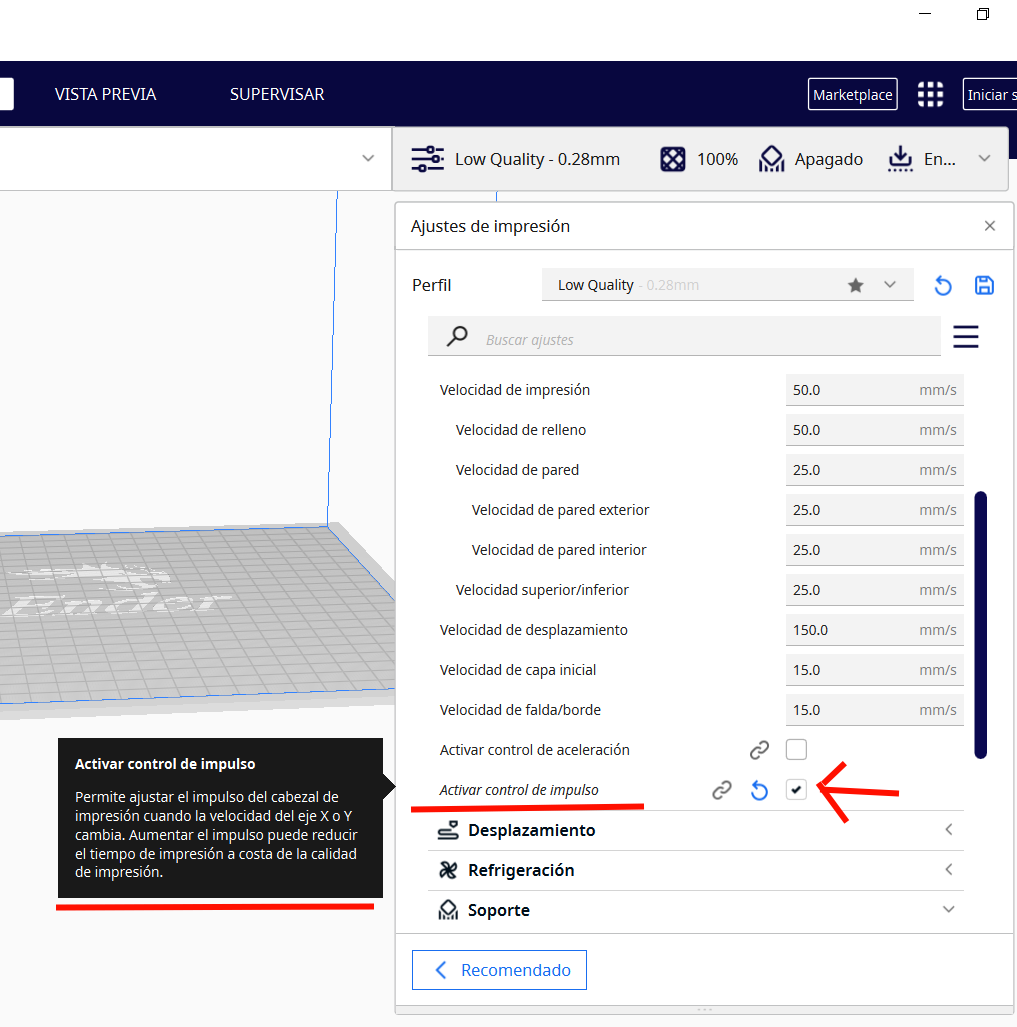 Velocidad de impresión demasiado rápida: Si la velocidad de impresión es demasiado rápida, la boquilla no tendrá tiempo de depositar el plástico de forma uniforme, lo que también puede provocar marcas en las esquinas. Prueba a reducir la velocidad de impresión en un 20% y vuelve a imprimir el cubo.