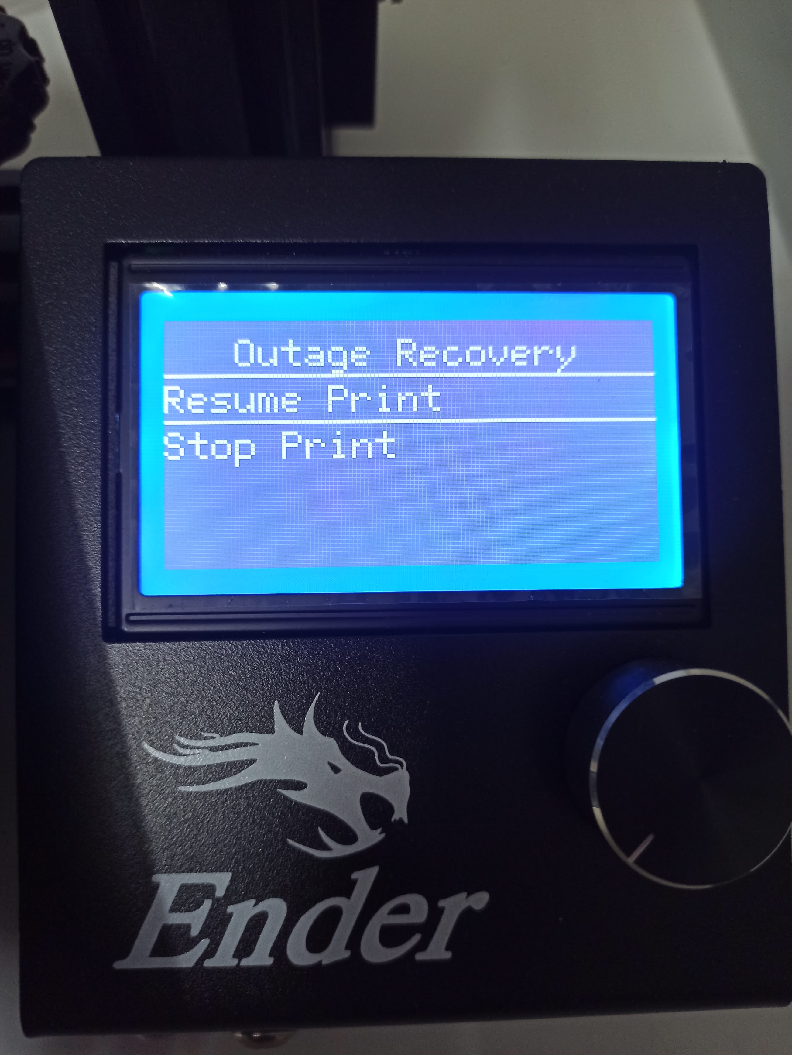 Me lo ha hecho 2 veces. La primera vez me encontré la máquina parada en medio de la impresión y la pantalla no indicaba nada, como si estuviera recién encendida. La segunda igual, pero indicaba "Outage recovery". Y esta vez sí que me ha permitido darle a recuperar.
