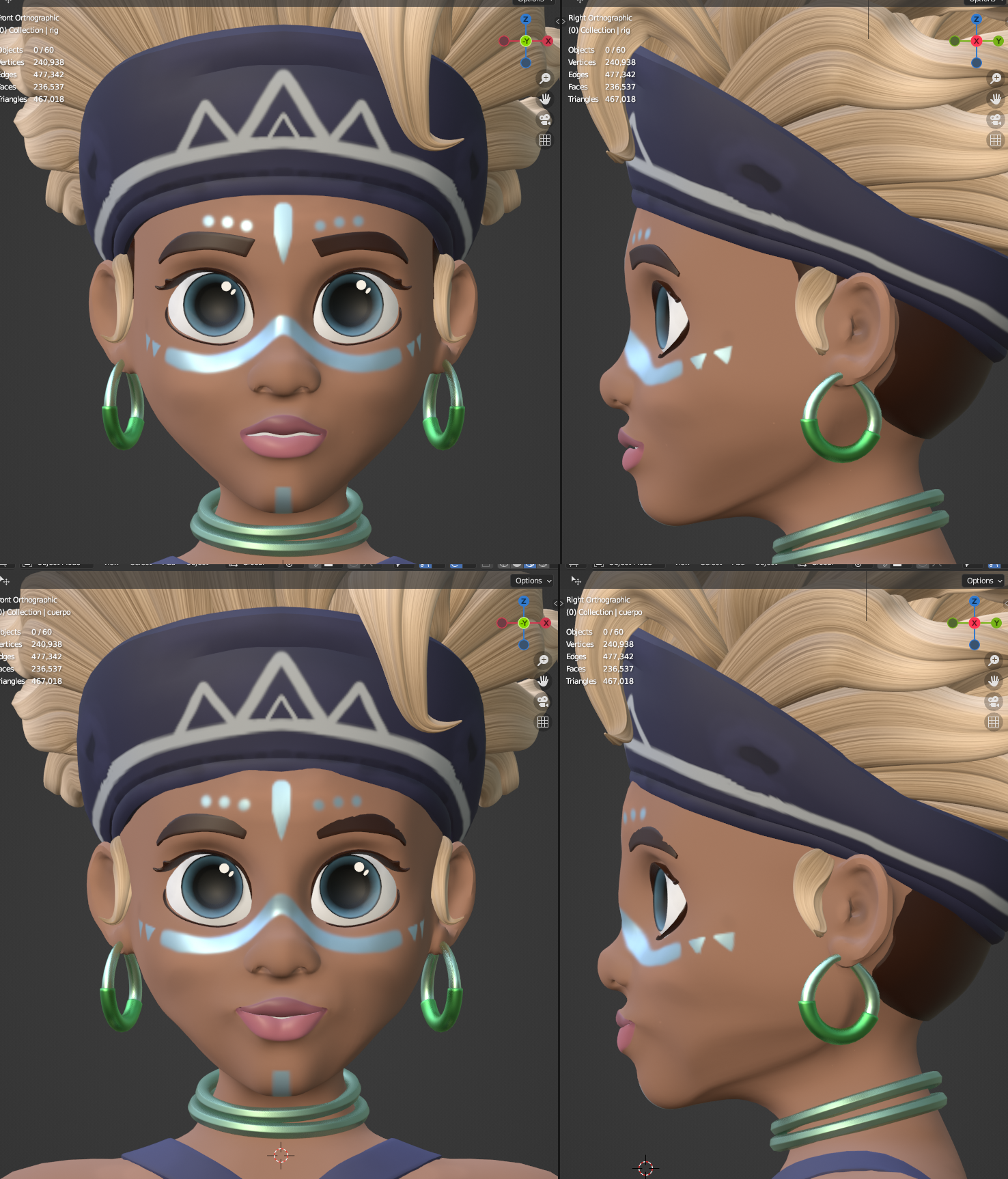 Pero con la cara, al activar el modificador Armature, se deforma entera. Fijaos en la imagen siguiente, sin el modificador y con él activado.