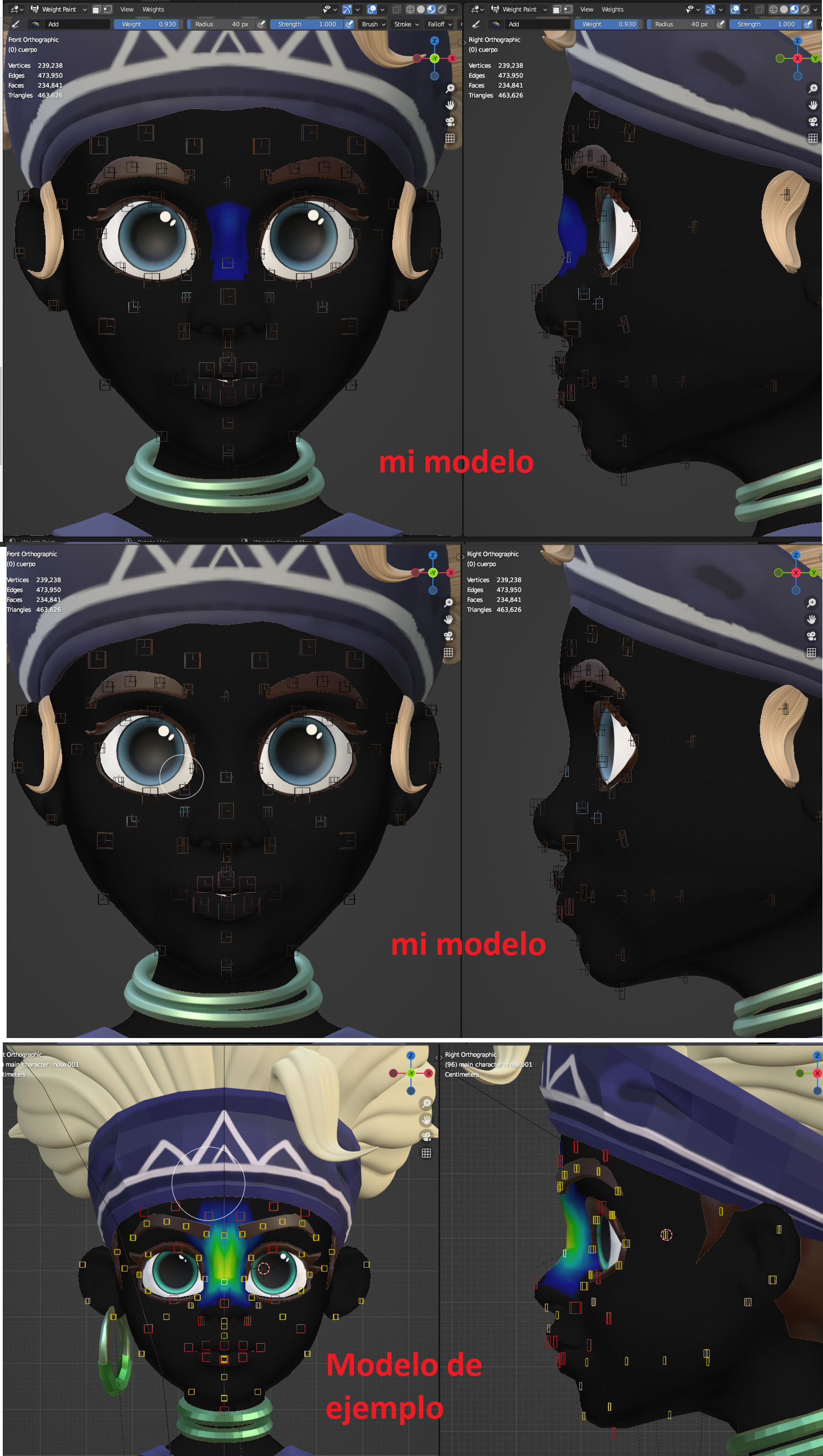 Estoy intentando corregir estas deformaciones con Weight paint, pero no soy capaz. Selecciono el hueso de la nariz y veo que si borro todo el peso, dejándolo todo negro, se quita la deformación. No veo pulsando con Shift+botón derecho ningún otro hueso que afecte a esa zona. Pero en cuanto le doy algo de peso, aunque sea muy ligeramente en azul, ya se deforma. En el modelo de ejemplo del curso, este hueso tiene mucha más fuerza, está incluso en verde y no se deforma así...