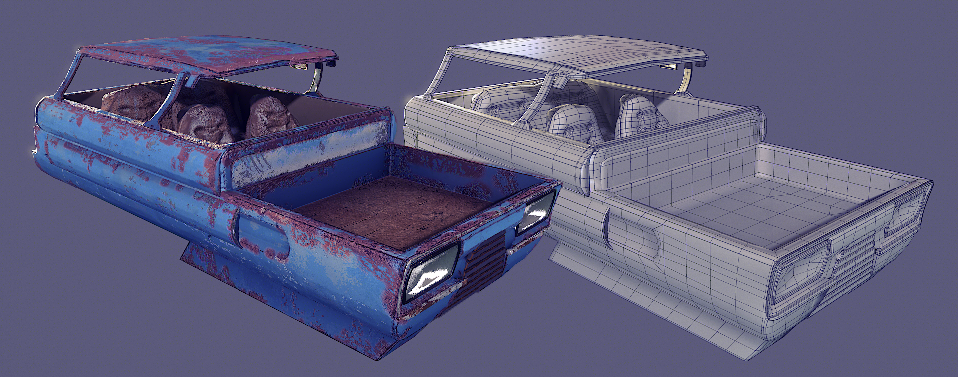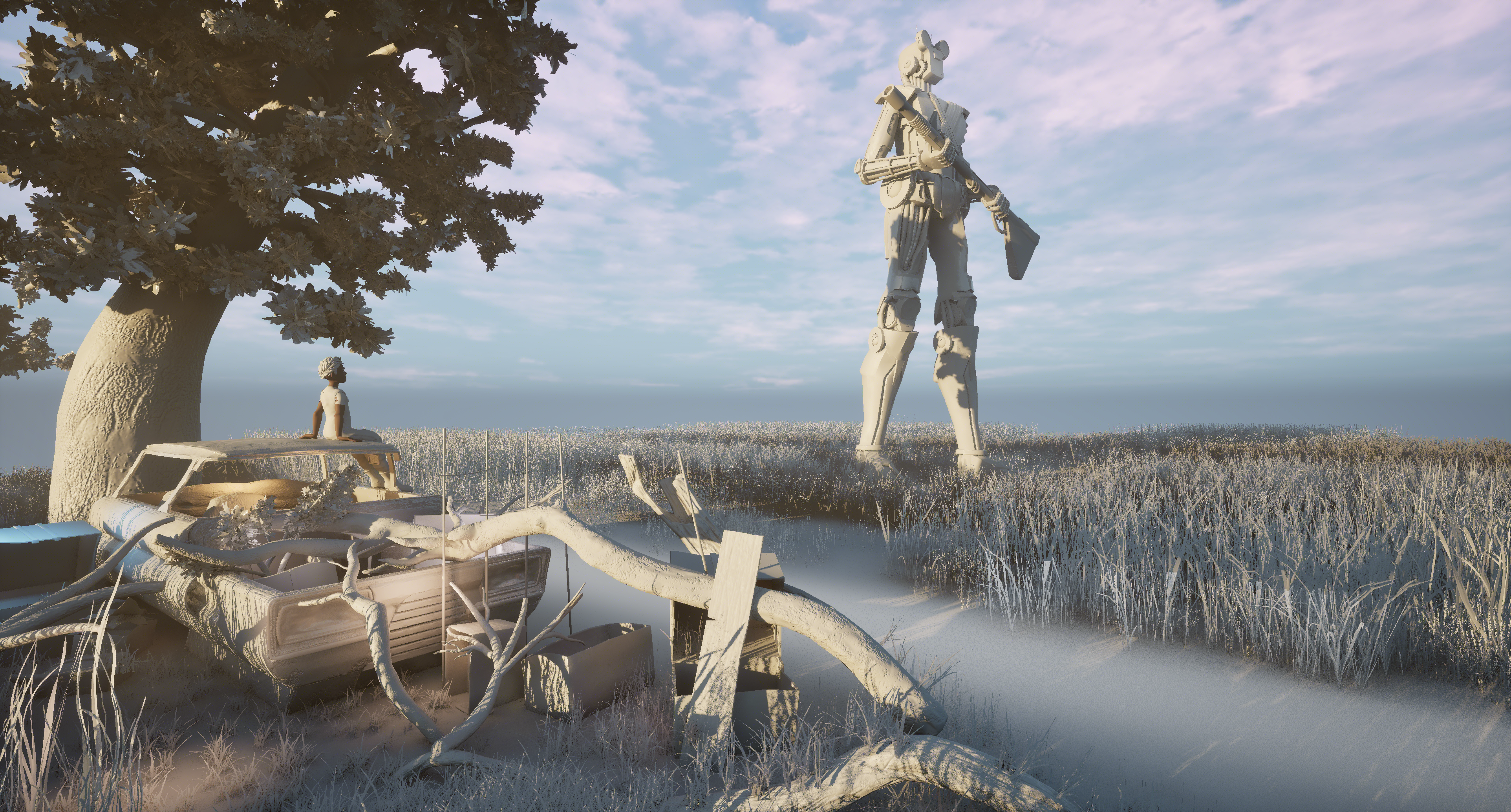 Todo el modelado fue realizado con Blender y Zbrush, enfocado hacia una topología más orientada a tiempo real, pero cuidando los acabados cinemáticos que suelo realizar. El rig de los personajes se hizo con Maya y luego se llevó a Unreal Engine. Se realizó una pequeña y mínima corrección de color en Gimp para darle el toque final.