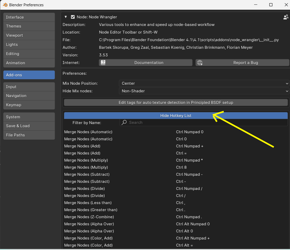 Si en Addons pinchamos sobre la pestaña del nodo Wrangler la opción de ver todos los atajos de teclado, podremos ver un lista bastante larga de todos los que hay para las diferentes opciones.