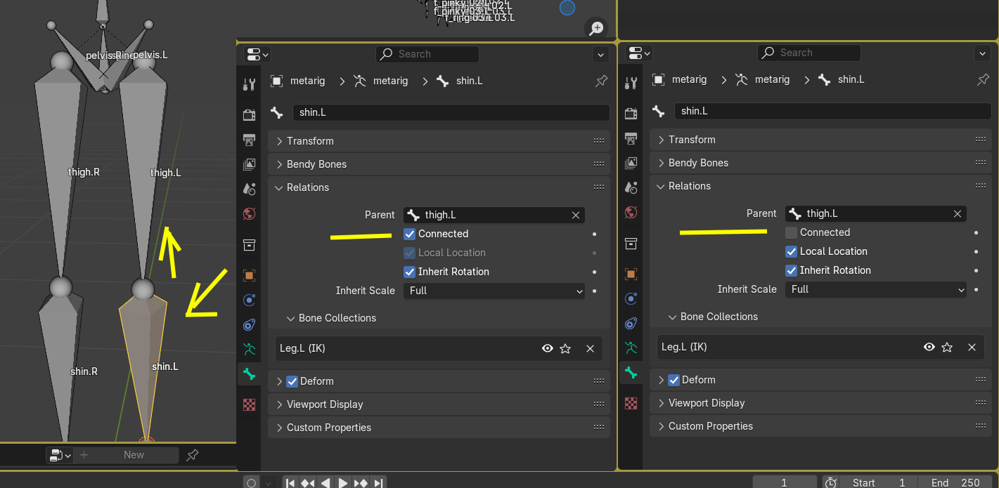 Hola, tengo un rig con una cadena de huesos deformadores que están todos conectados con su hueso anterior. Cada tail comparte transforms con la head siguiente, lo he comprobado mil veces, y los radius están configurados igual, head emparentada con tail. Sin embargo, algunas uniones resultan así. Dejo imagen en Dropbox, ya que no me permite subir archivos.