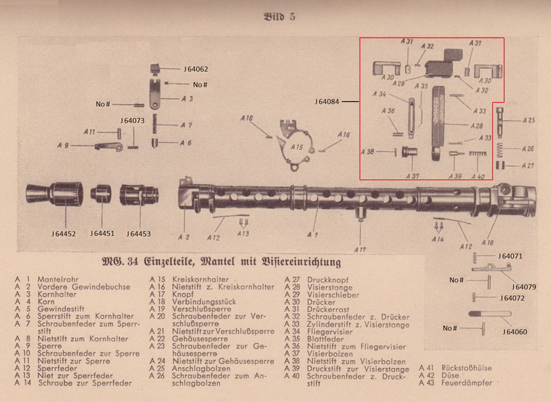Hola, estoy haciendo un modelo de la MG34 con todas sus piezas y estoy teniendo problemas con la "camisa del cañón". He encontrado muchas imágenes, incluso manuales (que, al estar fotocopiados, carecen de utilidad) y libros, pero no encuentro ningún plano sobre esa pieza, más concretamente la parte donde va el alza (la pieza A18 de la imagen). Es quizá la pieza más compleja, y no quiero acabar haciéndola a ojo, ya que quiero hacer una reproducción fiel. ¿Alguien tiene algo?