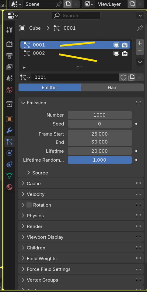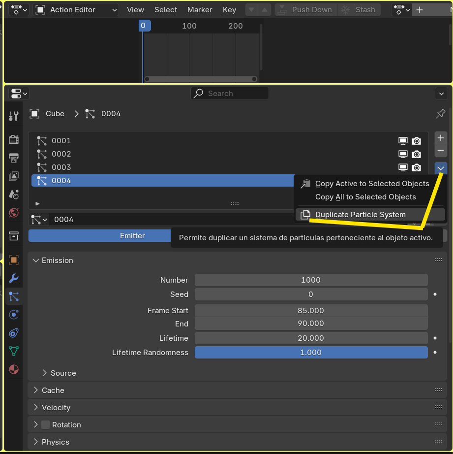 Luego usa la opción de Children en el sistema de partículas o crea un sistema completamente nuevo. Si optas por este último, puedes duplicar tu objeto emisor y asignarle el nuevo sistema, sincronizado para que comience cuando las partículas del primero lleguen a su punto de estallido.