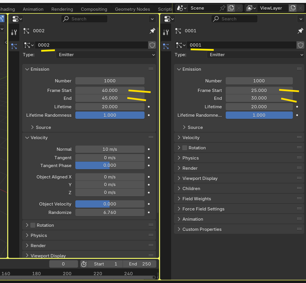 Se pueden duplicar las partículas, para no tener que poner todos los valores otra vez, PERO, hay luego que desactivar la opción de que sirva para los dos igual, pues cualquier cambio que hicieras en uno, se harían en el otro, y hay que pinchar sobre el (2) que sale, que indica que ese valor se comparte con otra partícula. Luego ya puedes modificar los valroes sin que afecten al otro.