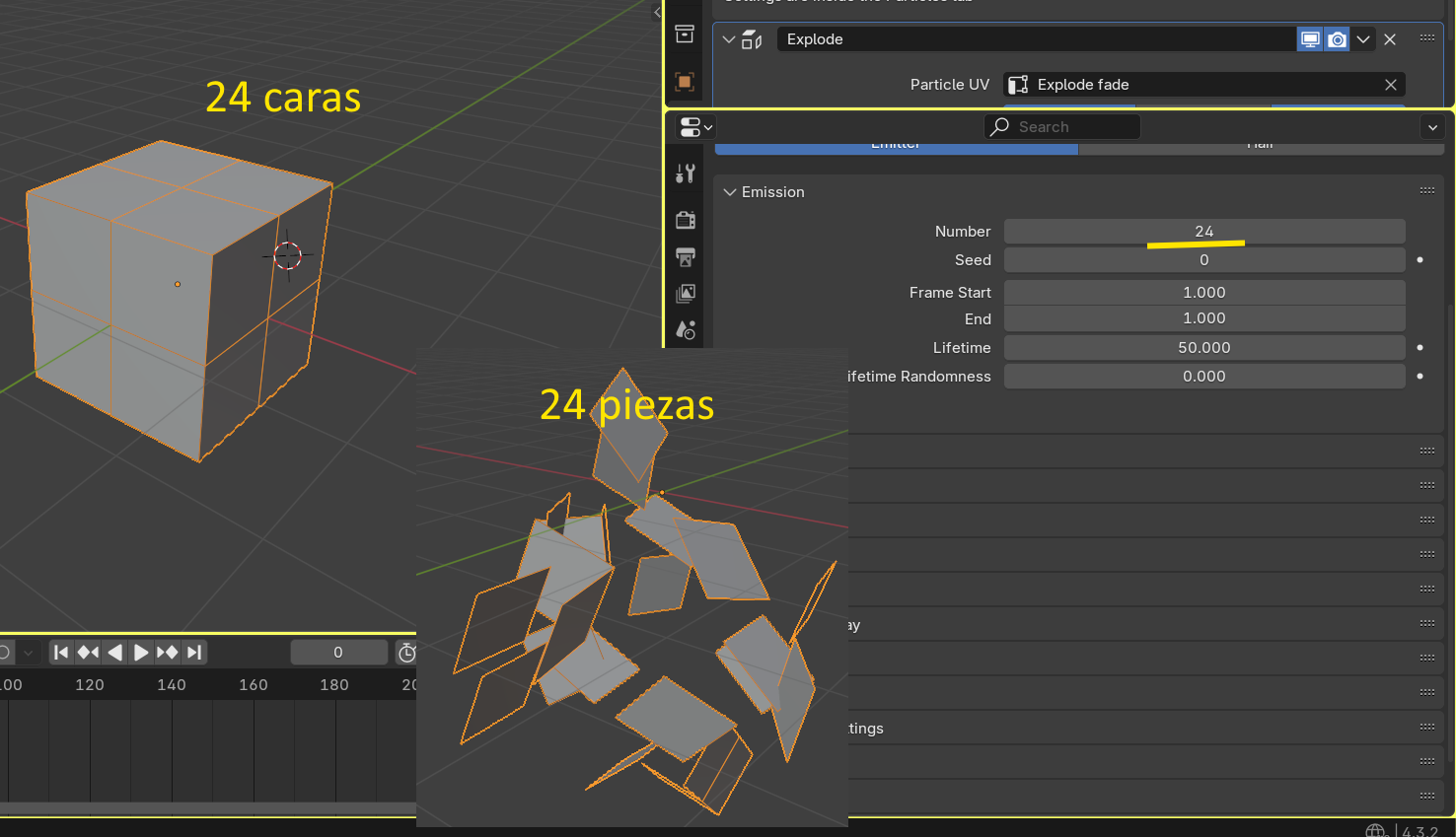 A ver, he probado con un cubo subdividido donde tiene 24 caras, luego en las partículas pongo que tenga 24 y salen las 24 piezas cortadas....