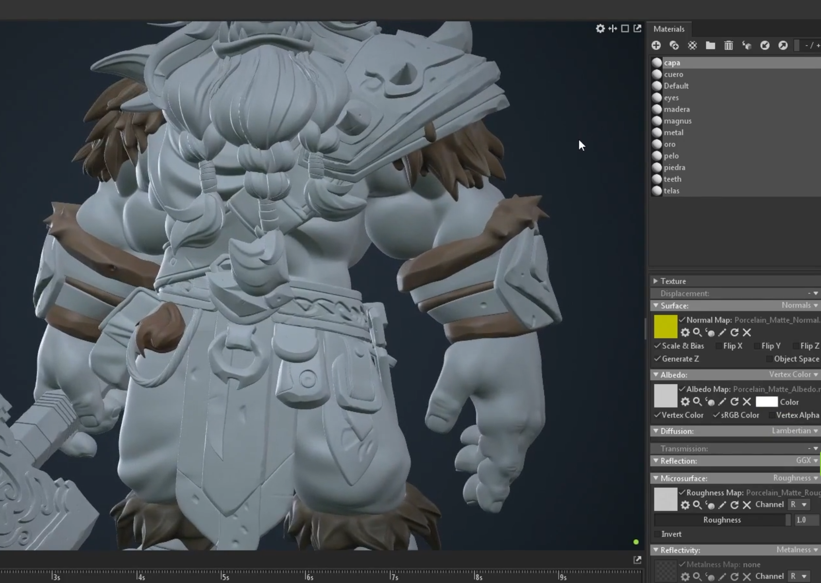 ID de material por polygroups dentro de ZBrush antes de exportar. Así, al importar a Marmoset, puedes hacer que cada parte tenga su material listo para aplicar texturas, shaders o mapas. Es un poco más complicada por eso.