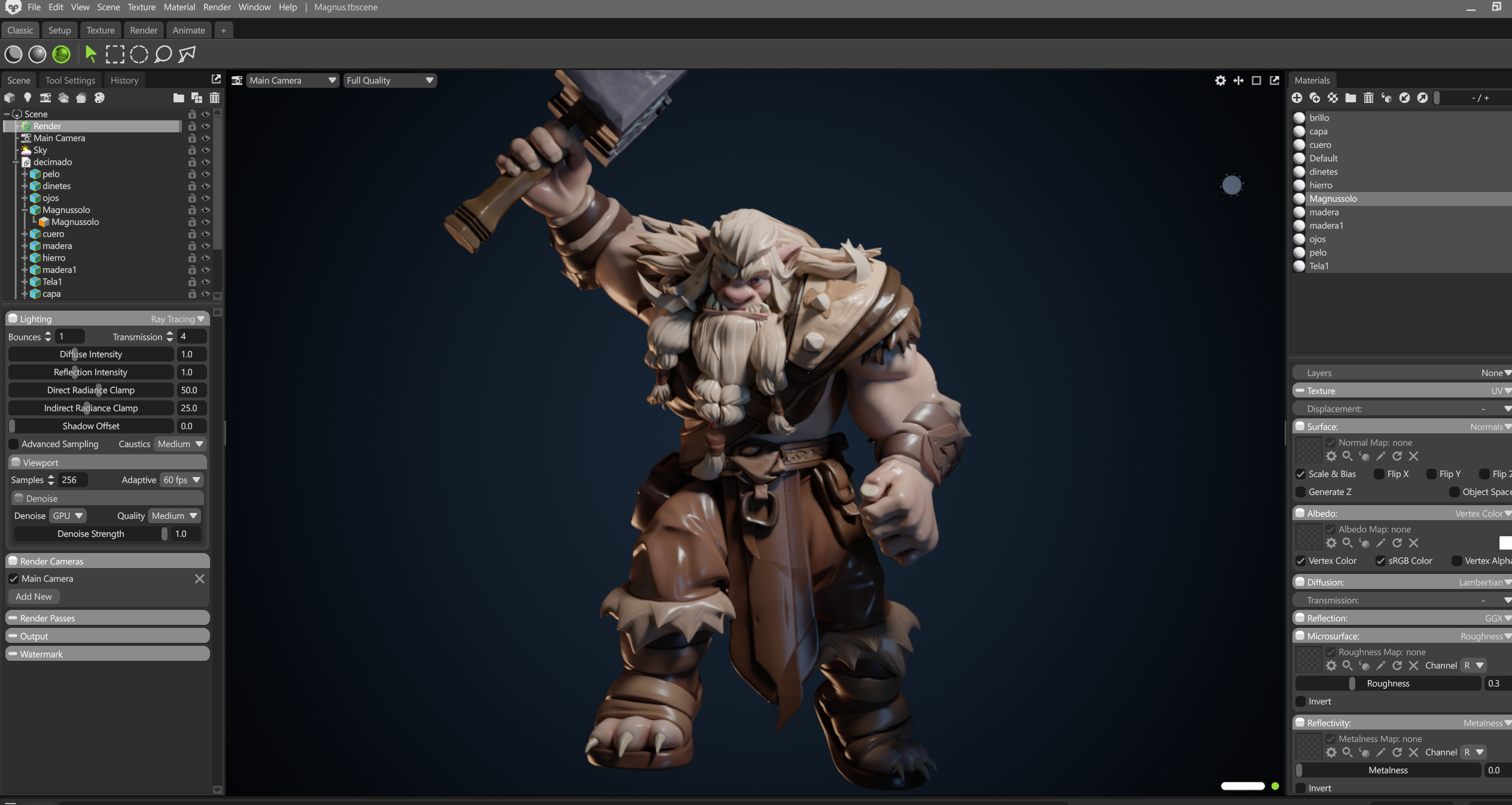 Otra opción es asignar un ID de material por polygroups dentro de ZBrush antes de exportar. Así, al importar a Marmoset, puedes hacer que cada parte tenga su material listo para aplicar texturas, shaders o mapas. Es un poco más complicada por eso.