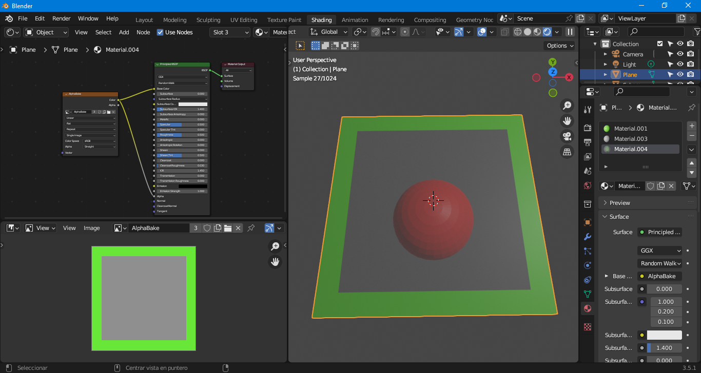Para solucionar esto, crea un Mix Shader que combine tu material con un Transparent BSDF. Conecta la máscara o el valor de Alpha al factor de mezcla. Luego, en el nodo de salida del material, asegúrate de que el Alpha está conectado correctamente al canal que usarás para el bake.