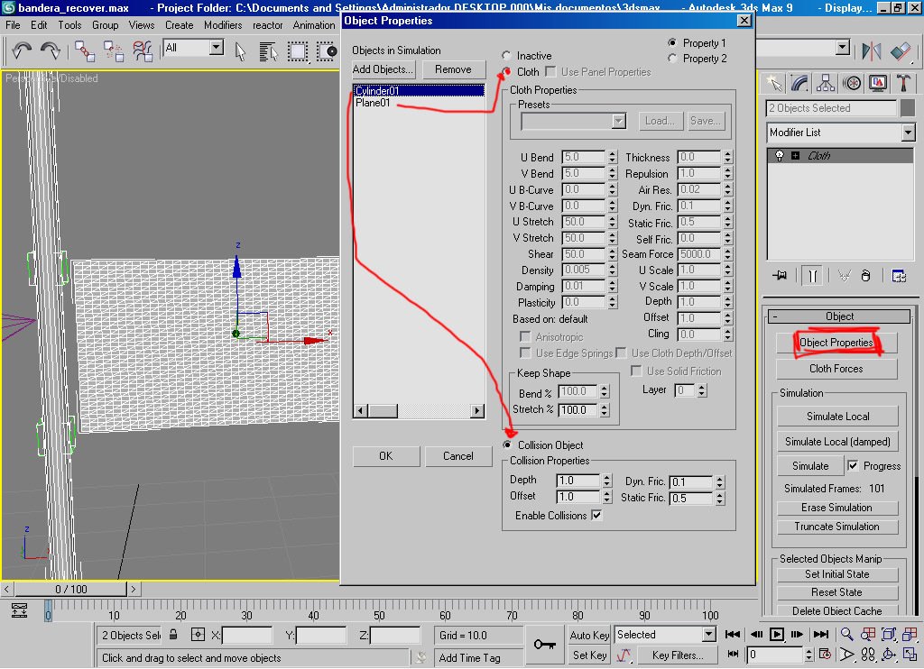 6. Presiona object properties, selecciona el cilindro y activas collision object, y para el plano activa Cloth y presiona ok.