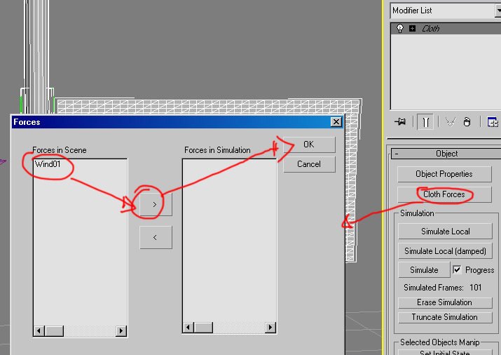 7. Ahora presiona Cloth forces selecciona wind01 y lo asignas a forces in simulation.