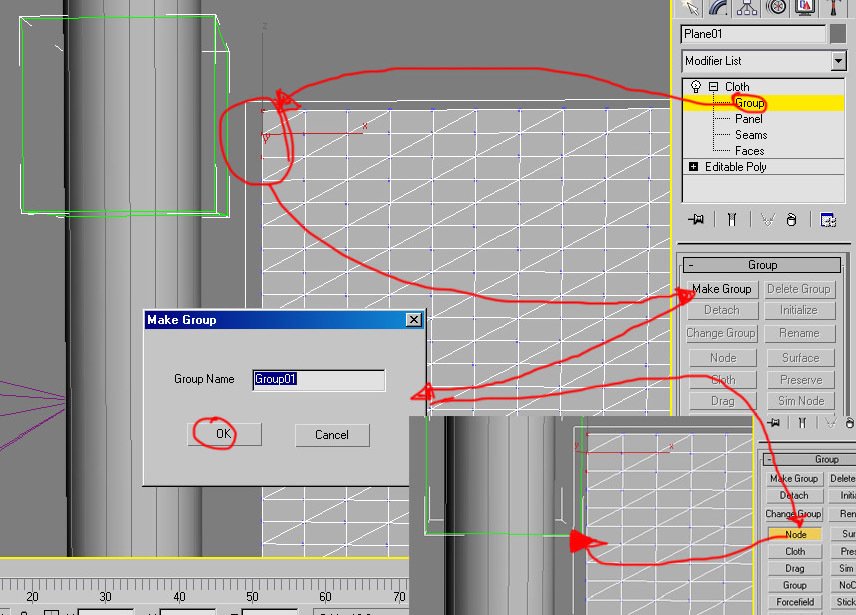 8. Para este paso selecciona la bandera anda a group selecciona unos cuantos vértices de la esquina superior, presiona make group luego ok, y se va habilitar el comando node lo presionas y selecciona el dummy que está a la altura de los vértices que seleccionaste, debes hacer lo mismo con el otro extremo de la bandera.
