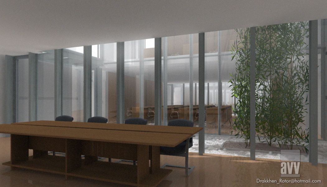 Hola, yo pondría también sillas en este lado de la mesa, y en el sitio de presidencia, otra un poco girada, (un punto de informalidad), intentaría que hubiese más saturación en las zonas iluminadas, si la iluminación es cenital, creo que la luz debería ser más intensa y el efecto del volumen luminoso, quizá teñirlo sutilmente de amarillo por la luz solar, por último además, de darle algo de reflexión a la mesa y a las patas de las sillas, pondría algunos objetos sobre la mesa: un par de ceniceros de cristal y un jarrón con unas flores amarillas. ¿habéis visto doctor Zhivago? En esa película aparecen varios planos en los que hay una gama corta de colores, pero terminando de componer el plano siempre había unas flores amarillas, (el director de fotografía era un fuera de serie).