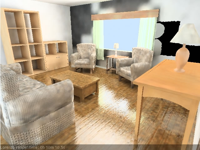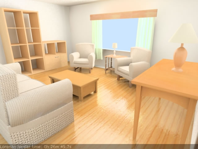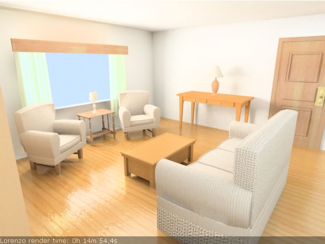 Y le he bajado a 30 los rebotes secundarios por el problema de que se me pintaba mucho la escena de naranja (del piso), ahora estoy un poco más conforme, pero aún quiero ponerle un cristal en el ventanal, postproducción en Adobe Photoshop y más calidad en el Irradiance Map, saludos.
