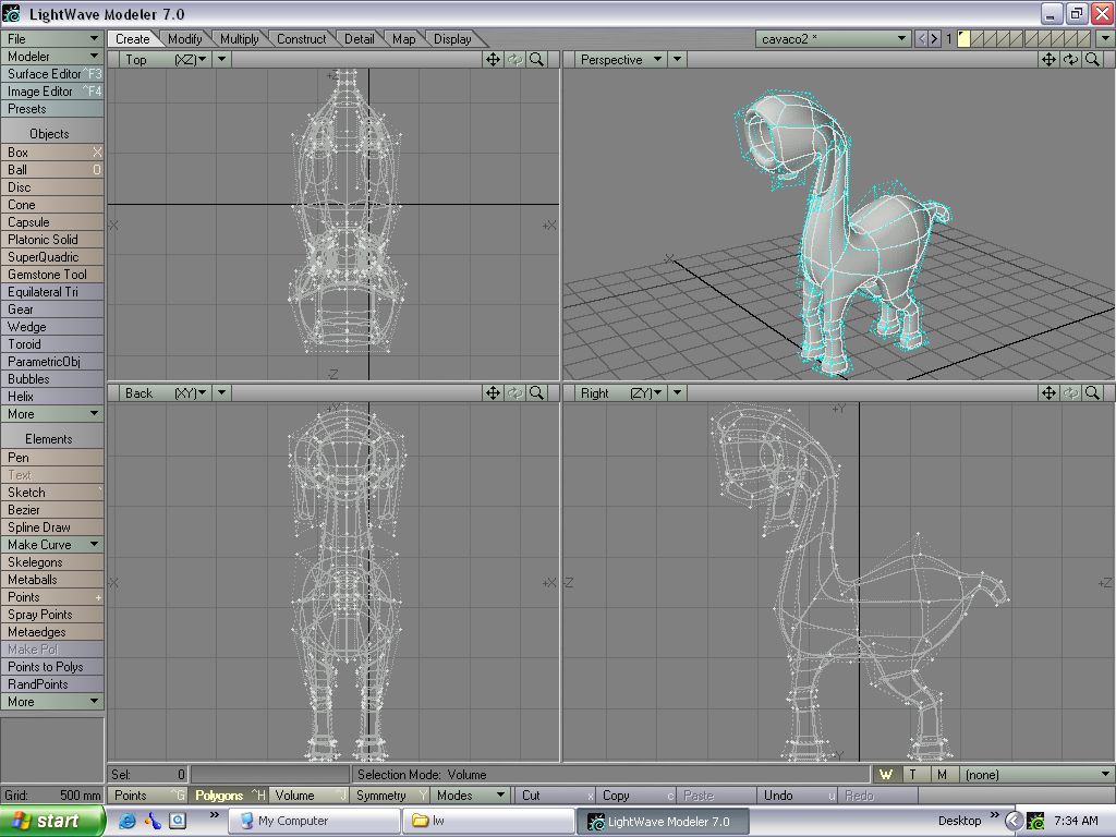 Ayer instalé y me puse a toquetear por primera vez el LightWave 7 y puedo decir que no está tan mal (comparado con max). El único problema que le veo es la interfaz ya que para uno que está acostumbrado al Windows se queda algo perdido con algo diferente, supuestamente LightWave era superior a max, pero para mí la nueva versión de 3ds Max 5 definitivamente ha superado a LightWave, aunque dicen que los hypervoxel son la ostia, pero como siempre uno tendrá lo que el otro no, en fin, creo que mejor sigo con mi querido max. Pero bueno les quería enseñar el modelo que hice ayer, está simplón pues no sé cómo meterle detalle sin usar el Knife (slice en 3ds Max) pues es muy tedioso usarlo, ¿alguien sabe si existe algo como el Cut de los edit polys de 3ds Max? Otra cosa LightWave no tiene aristas o Edges, solo vértices y polígonos, ha y también me di cuenta que LightWave usa subdivisiones reales, ese si es un punto muy grande a favor y no son tan lentas como las malditas subdivisiones de Autodesk Maya, les muestro este bicho feo.