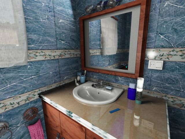 Con respecto a tu imagen, creo que la iluminación es un tanto oscura, y con sombras un tanto forzadas. Podrías hacer una cosa, como en el baño hay una ventana, prueba a iluminar la escena desde esa ventana y ver que consecuencias tiene, ya a partir de ahí ir sacando pruebas y descartando las no útiles.