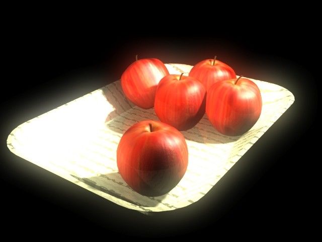 En las manzanas quizás has usado demasiado glow, probaría con un poco menos y a evitar los grandes brillos de la bandeja. Las manzanas tienen una reflexión demasiado perfecta, prueba un mapa de reflexión o simplemente trabaja con el especular. La textura de las manzanas te ha quedado muy bien.
