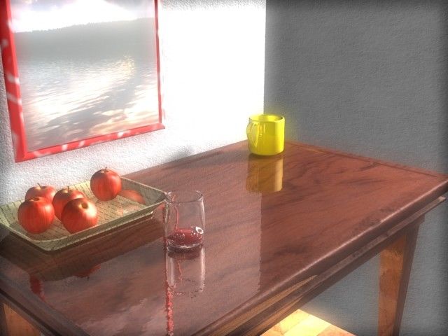 Yo le haría algún cambio, primero centralizar la composición en los tres elementos y en una zona de la mesa. También tendrá cuidado con el cuadro. No sé si es por la textura del marco o por estar demasiado iluminado, pero se ve raro, tampoco le añadiría el glow que le has puesto a la imagen, se nota demasiado, fíjate como alrededor de la taza amarilla hay zonas que no deberían tener este color, en cuanto a la iluminación. Al usar técnicas tradicionales hay que tener en cuenta la posición de la luz. La normal de una cara con respecto a la posición de la omni determina su grado de iluminación. Si te fijas, una de las paredes está muy iluminada mientras que la perpendicular está extrañamente demasiado oscura. Puedes solucionarlo moviendo la luz, o añadiendo alguna más (tendrás que reducir los multiplicadores de todas), aunque creo que si modificas la composición de la escena puede que no sea necesario, ya que quizás no veas la otra pared, lo malo de jugar con pocos elementos es que hay que pararse mucho en los detalles. Lo bueno es que permite experimentar combinaciones y avanzar paso a paso, como consejo para la composición, dedícale tiempo al espacio vacío. Me parece muy interesante la zona del frasco de cristal y su reflejo en la mesa. Acércate más a ver qué sale. Saludos de Drakken rotor.