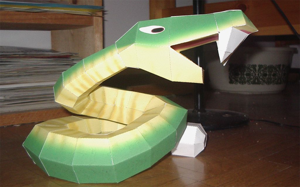 Bueno, tengo visto que os gustan los recortables así que, aquí os dejo uno que he hecho, la verdad es que las juntas no me han quedado bien, pero es que, era complicado. El proceso es el siguiente, hice la serpiente con 3d Studio Max y luego la pase a papel con un programa que te pasa la Maya 3d a papel (Pepakura se llama creo) y después ya solo es recortarr, hay queda eso, la primera imagen es en 3d(no sé si este mensaje va aquí, pero ahí queda) http://usuarios.lycos.es/Levoweb/yonkis/snake1.jpg