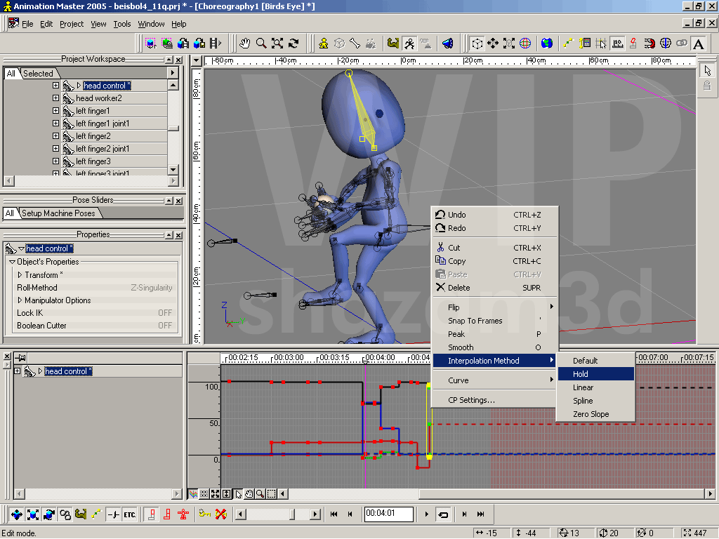 Te dejo captura de un ejercicio que nunca terminé para esmaya. En a:m es muy fácil: Alt+2 para desplegar el timeline. Seleccionas el hueso cuya animación vas a editar. Seleccionas las claves en las curvas de animación que te interesen, click con el botón derecho del ratón y luego en la ventana emergente seleccione el tipo de interpolación. en este tutorial de Keith Lango se describe el proceso perfectamente, aunque se equivoca llamando held en lugar de hold a esta función en a:m. Saludos animados, Shazam.