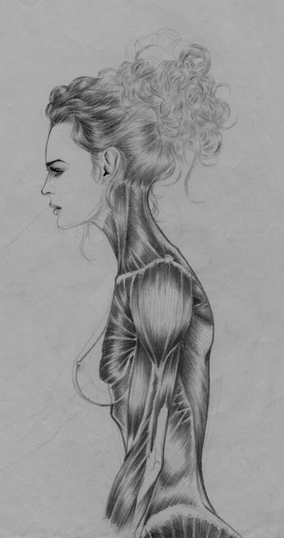 Muy bueno, pero a pesar del concienzudo dibujo anatómica tienes errores, la oreja elevada, la unión del trapecio con los deltoideoosí.mmh vaya ya no me acuerdo, merda.