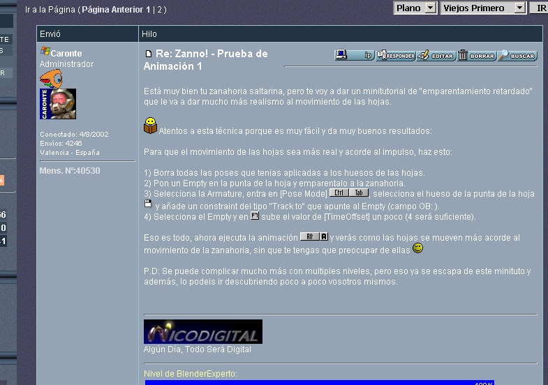 La siguiente duda es que cuando estaba en nicodigital vi que Caronte daba una especie de minitutorial para mover las hojas de zanno (el personaje de Venom GFX) con una especie de pseudofísica, recuerdo que lo hacía con empties y poco más, si alguien lo sabe nos ahorraría mucho trabajo, ya que nuestros personajes son conejos.