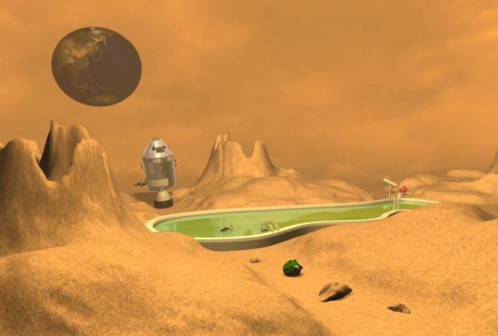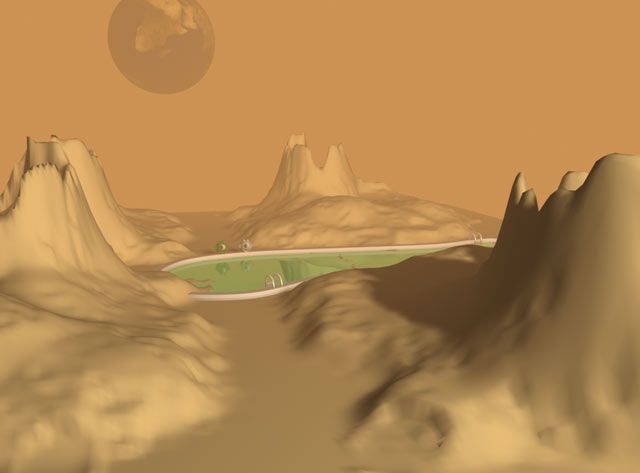 Dales tiempo la primera imagen pinta bien, pero yo le metería más detalle al terreno pues está muy limpio. El cielo también está muy limpio, le metes nubes rojizas, eso que este en marte no quiere decir que no las tenga el color del terreno debería ser un tanto más rojizo ¿no? También en el horizonte yo le pondría otras montañas o un vacío o barranco, el modelado de las montañas me gusta, ¿Qué es eso que se ve en el centro del terreno? ¿la piscina con tus personajes? O los personajes son enormes o las montañas son enanas. Otra cosa es que yo me trabajaría más la iluminación, ¿tal vez una GI?