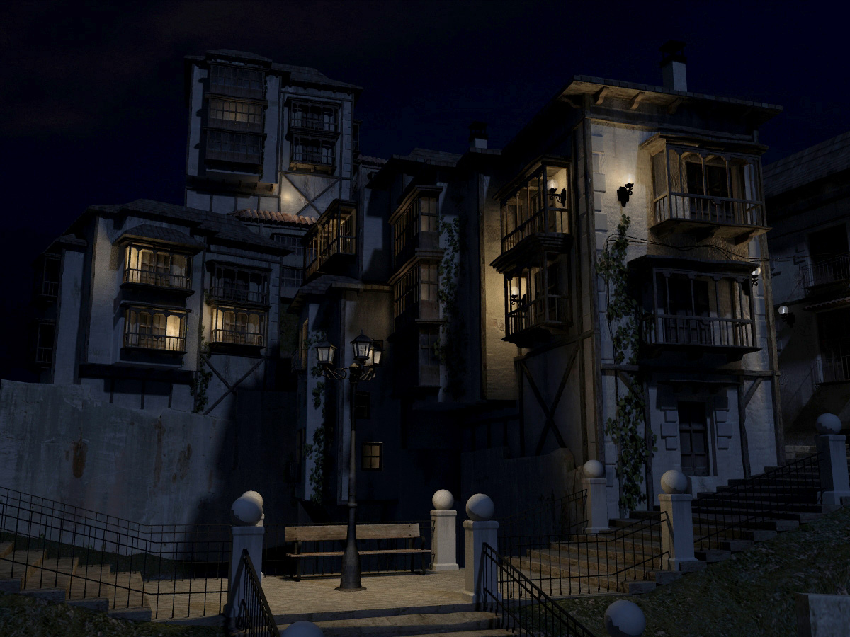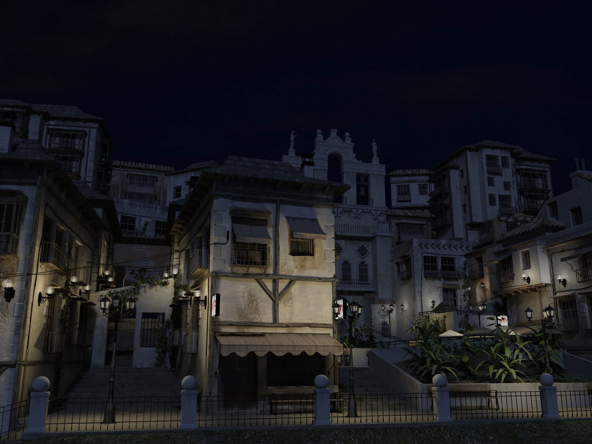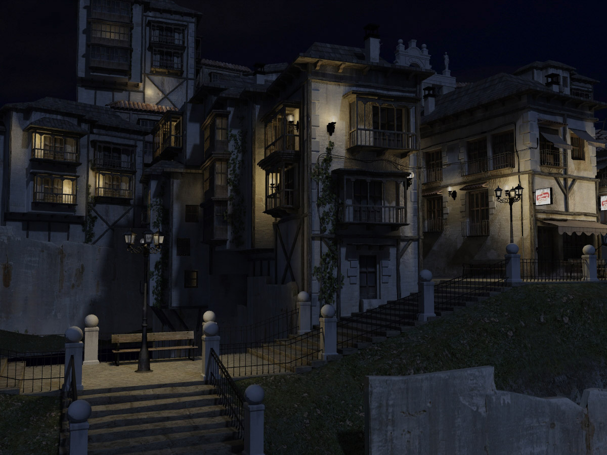 Excelente trabajo, mucho curro de modelado y texturizado. Lo que menos me convence es la iluminación. Yo seguiría trabajando tanto la diurna como la nocturna. En la nocturna lo que te han dicho: subir la luz ambiental azulada, y aumentar la intensidad de las farolas. La diurna no está mal, quizás le daría más intensidad a la luz solar, y un tono más azul a las sombras, habría que verlo, y por supuesto un bonito cielo azul primaveral del mundo feliz de la piruleta.