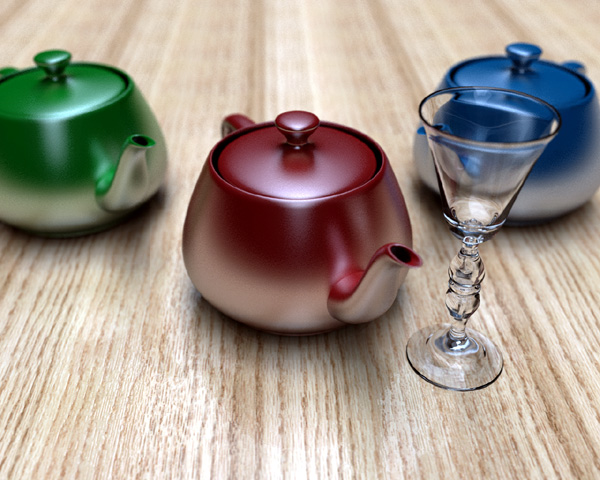Podría alguien simular esta imagen con el Mental Ray del 3ds Max 7, es por simple curiosidad, la imagen es bien sencilla, tres teteras, una sola luz, nada de HDRI, suelo de madera, Mental Ray 2.1 standalone.