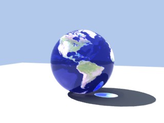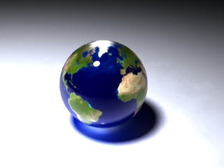 Mira yo para hacer esto en el 3ds Max haría lo siguiente, lo más fácilon, coge has un esfera con material de vidrio (el típico que te puedes encontrar en la web de Mental Ray o de Vray) miras las opciones de cáusticas (por la red hay un montón de tutoriales de ambos motores de render) cuando hayas hecho esto y tengas tu esfera con cáusticas, has otra esfera un poco mayor y ponle un mapa de opacidad con el mapa mundi y ahí lo tienes, suerte y un abrazo.