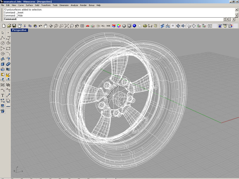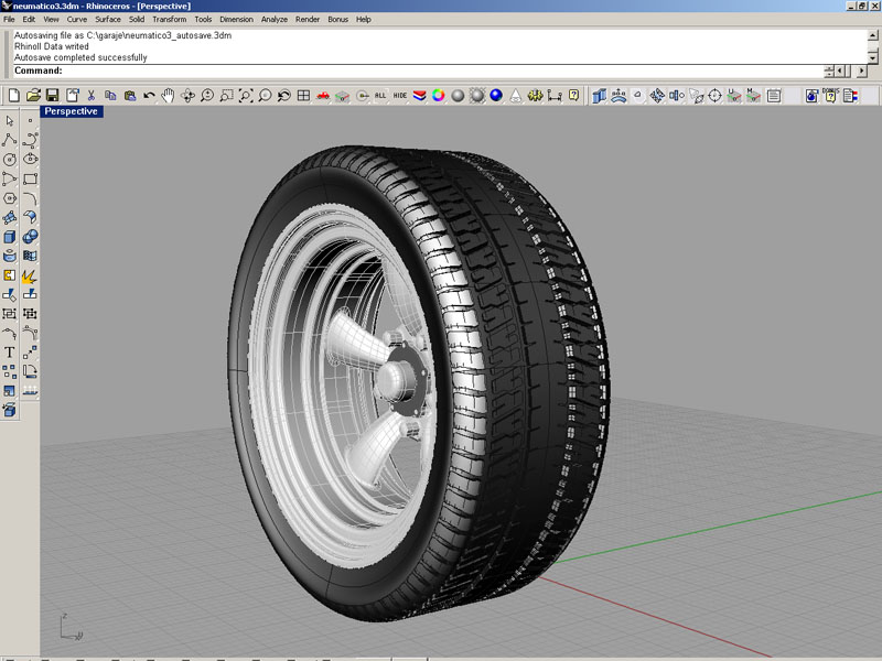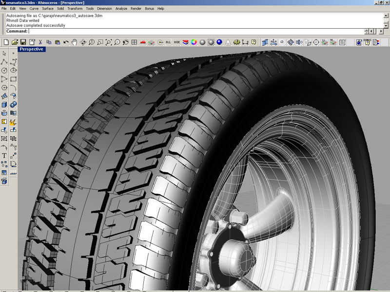 Por cierto, me he dado cuenta que no hay ningún tutorial bueno para hacer un neumático con dibujo para Rhinoceros (al menos yo no lo he encontrado), el mejor que he visto ha sido el del betle de Surland, com, pero es de 3ds Max.