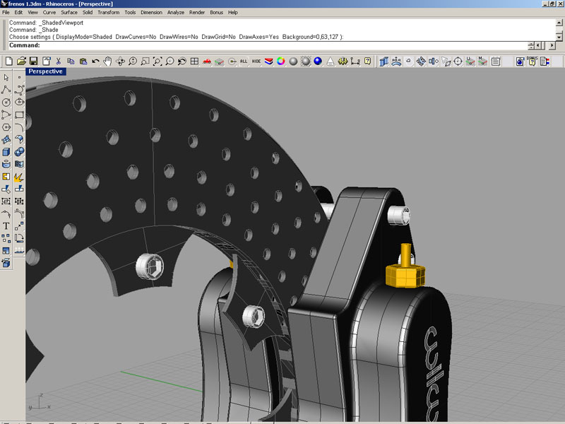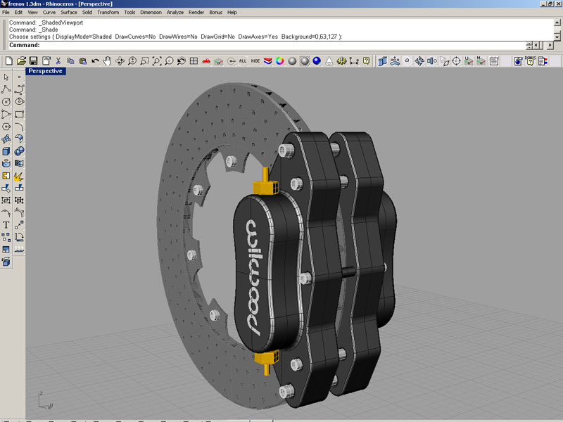 Pues exactamente la iluminación que estoy utilizando es.ninguna, esta por defecto. Meto los objetos por capas con sus respectivos colores y en Shade se ve cómo está en las capturas. No me interesa perder tiempo en luces y materiales con Rhinoceros, ya que todo eso lo hago en 3dsmax con Vray. Un saludo.