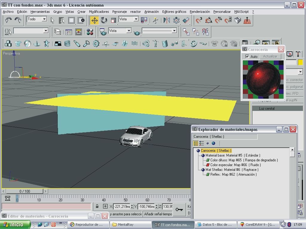 Hola estoy haciendo mi primer car render con Mental Ray y me han surgido unos problemas. Os explico un poco como lo he hecho, he creado un plano situado de manera oblicua a los ejes cordenados y le asignado un material con una imagen HDRI y un nivel RGB de salida de 128, por otro lado, al plano de arriba le he aplicado un mapa de salida en el Diffuse slot.