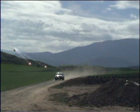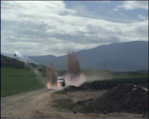 Y en último lugar, la sombra del helicóptero se proyecta sobre la estela de polvo, que levanta el coche, cubriendo parte de la misma. Quizás debieras añadir más partículas que se fundan con la estela y tapen parte de la sombra.