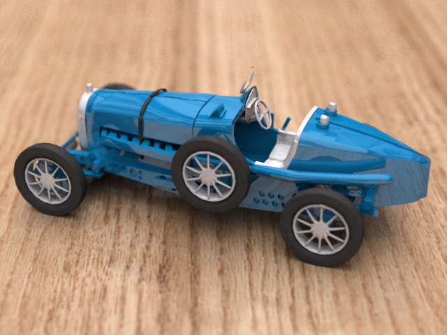 Hola mi objetivo era una miniatura de un bugati antiguo de juguete, materiales de plástico con una iluminación lo más realista posible.