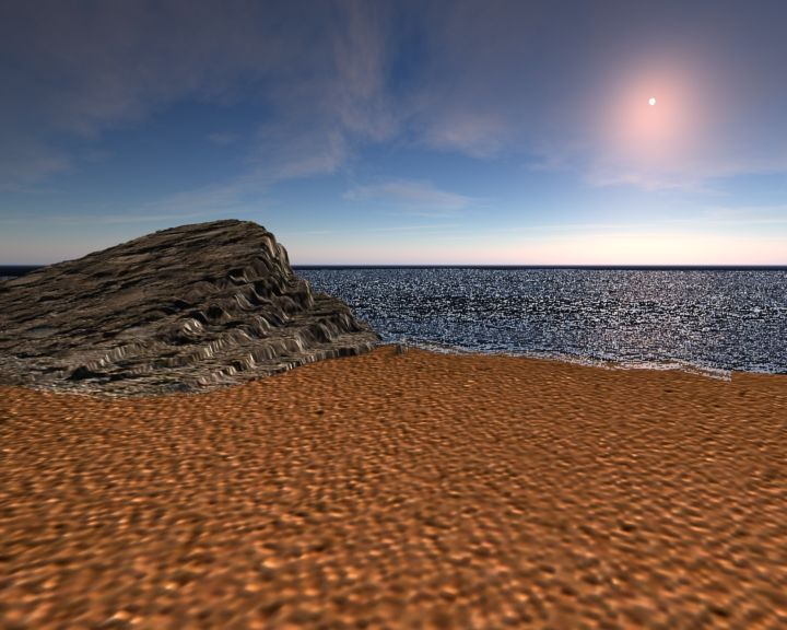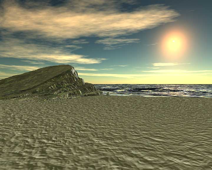 Hola estoy usando max 6 y renderizo con una combinación de Final Render y el plugin DreamScape, la arena es un mapa ruido con un modificador desplazamiento y el monte también, la malla del mar esta animada con olas que rompen en la playa y esta echa con DreamScape igual que el cielo.