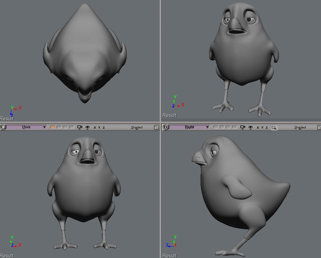 Bueno, he seguido dándole los rasgos generales al pollo, ya tiene alas y patas, queda moverle muchos puntos y ajustar bien la malla. Le he añadido más loops y Edges y retocao algunas cosas, aquí tenéis lo que va saliedo, las patas no son definitivas, solo son una aproximación de volúmenes, todavía les queda trabajo. Tened en cuenta que como el pollo tendrá Hair, las alas ahora parecen algo pequeñas (aunque le da un aire ton que me mola https://www.foro3d.com/images/upload.../2005/05/6.gif) al aplicarle el pelo, todo el personaje se verá aún más inchado, bueno, ya me iréis comentando cómo lo veis.